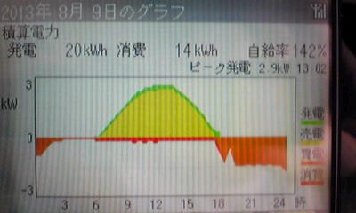 日中の気温は40℃越え。日中出かけて家にいないときでも、夜はエアコンを使わざるを得ない。我が家の太陽光発電の実績にも、そんな状況が見て取れる。雲がない晴天の日、発電量のグラフは日の出から日の入りまでの綺麗な山形となる。家に人がいないと、家電の待機と冷蔵庫だけが電気を消費する。従ってグラフの黄色い面積が売電量となり、発電した殆どが売れたことを示している。夜はエアコンを稼働したことをグラフの橙色が示している。この日は〆て発電20kWhに対して消費は14kWhとなり、自給率は142%。夏に家にいるとき、日中にエアコンを使うのでこんな数字にはならないが、このような電気使用の見える化が、節電意欲につながるのがよい。