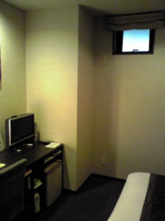 和歌山駅前のホテルに泊まった。そのホテルの部屋。なんと外を望める窓がない。部屋に入った瞬間、監獄を思い出した。窓から脱獄する自分を連想した。窓を開けると隣のビルの外壁というのはたまにあるが、手の届かない高窓だけの部屋は初めてだ。一人前にカーテンが付いているのがご愛嬌。県庁所在地の駅前で1泊5500円ならばこんなものか。他には何の問題がない。窓だけが不満のホテル。