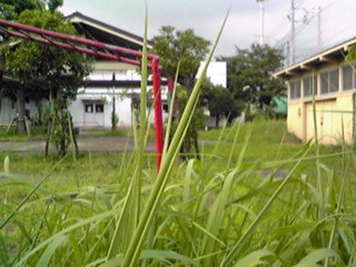 生家に立ち寄った折に、故郷の小学校を塀の外から観察した。往時の建物はすっかり建て替わり、わずかにプールだけが昔の場所に残っている。我が家に向かう南側の境界から眺めたのが、この写真。学校の裏庭になっているのだが、それにしても雑草の繁茂がひどい。夏休みで、手入れができないないようだ。9月に生徒総出で草取りをするのだろうか?残念ながらその結果は確認できない。