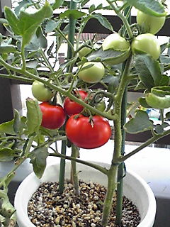 娘と共同生活をしているというか、たまに様子を見に行くというか、あるいはその中間の生活パターンなのだが、そのアパートの部屋のベランダに見事にトマトが実った。 元はと言えば娘が何かのイベントで苗を貰ってきたもので、有り合わせの鉢と用土で育てていた。ダメもとでベランダに出しっぱなしにして、娘が気付いたときに水遣りをしていた程度だが、順調に成長してくれた。背が大きくならず、脇芽も伸びず、鉢植えには最適の品種だったようだ。加工用で、味は濃厚だが外皮が固いと、パンフレットにある。おかげで雨に当たっても実が割れることがない。 最高に赤い実を一つ採って生で食べてみた。パンフレットの通り、固い皮の下にトマトの味が濃縮している。 娘よ、良いものをもらってきたな。