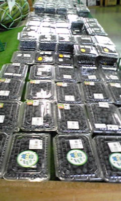 今年は夏が早く、ブルーベリーは不作と聞いたが、どっこい、あるところにはある。写真は、埼玉県美里の農産物直売所。1つの棚一杯に1000円也のパック詰めがずらりと並んでいる。200パックとして、全部売れて売上げは20万円。大した金額ではない。近所の観光農園では、この炎天下では摘み取りの客は少ないはず。客に摘み取ってもらえば手間はないが、農家が摘み取ってこうして並べるまでには大変な苦労があったのだろう。そんな苦労の成果がたったの1000円とは、ずいぶん安いものだ。人件費の塊のようなパックを2つ買って帰った。
