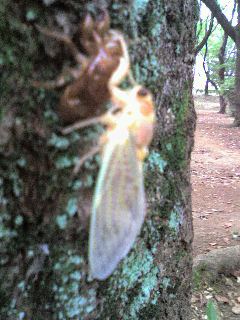 今日もせみ時雨の中を歩いていると、ちょうど羽化直後の光景に出くわした。