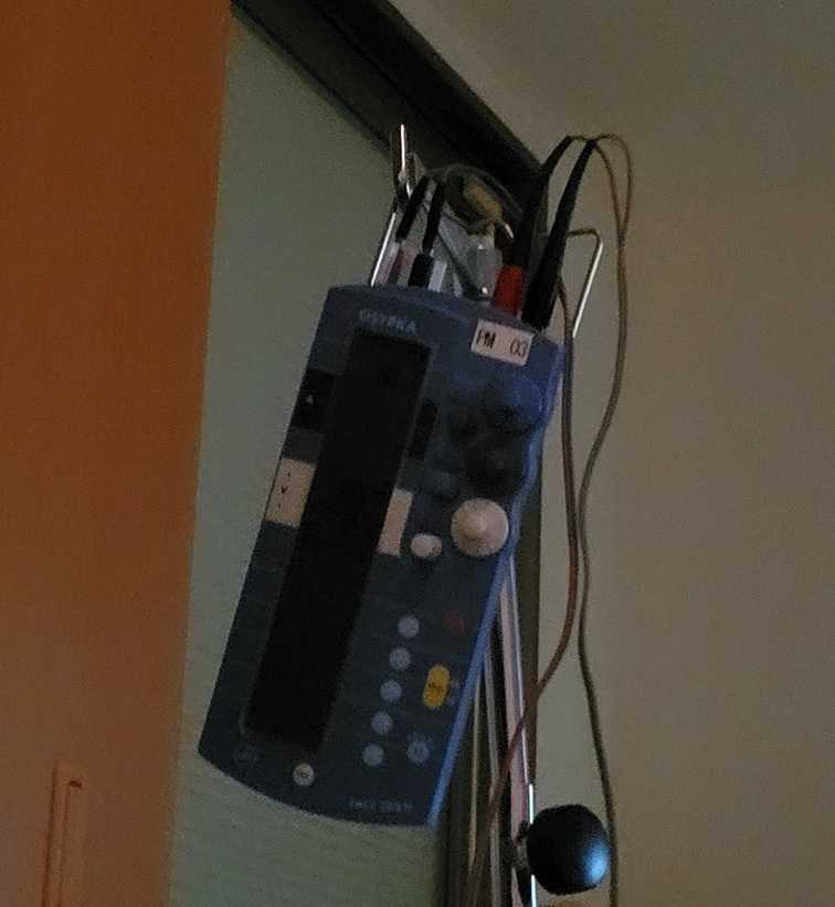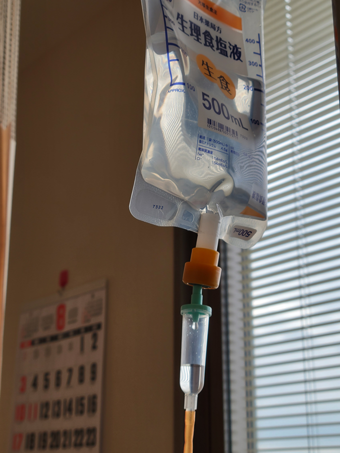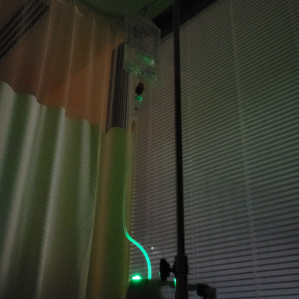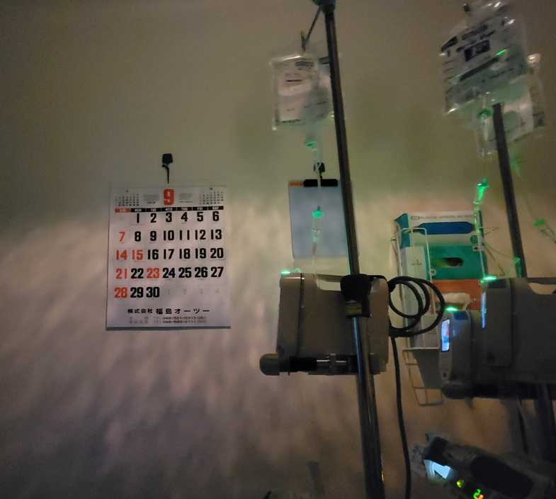 今の点滴は画像のような機器を使う。一分間に何ミリリットルと、滴下量がデジタルで設定される。滴下に合わせて点滅する緑の光は、まるで蛍のようだ。