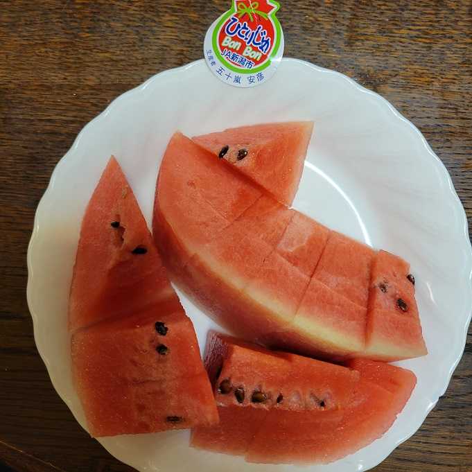 買ってきた小玉すいかを切ってから気が付いた。すいかの名前がラベルに「ひとりじめ Bon Bon」とある。一寸面白いネーミング。生産者の名前まで入っている。妻は積極的にすいかを食べないので、いつも私一人が食べることになっている。品種の特徴はネットに譲るとして、食した結果は十分に満足と言える。特に、皮が薄くて処理しやすい。因みに、私の食べ方は画像のよう。1/8カット毎に包丁で皮を分け、山形に切り分けた後とフォークを使う。これで手を汚さずに食卓で食べられる。
