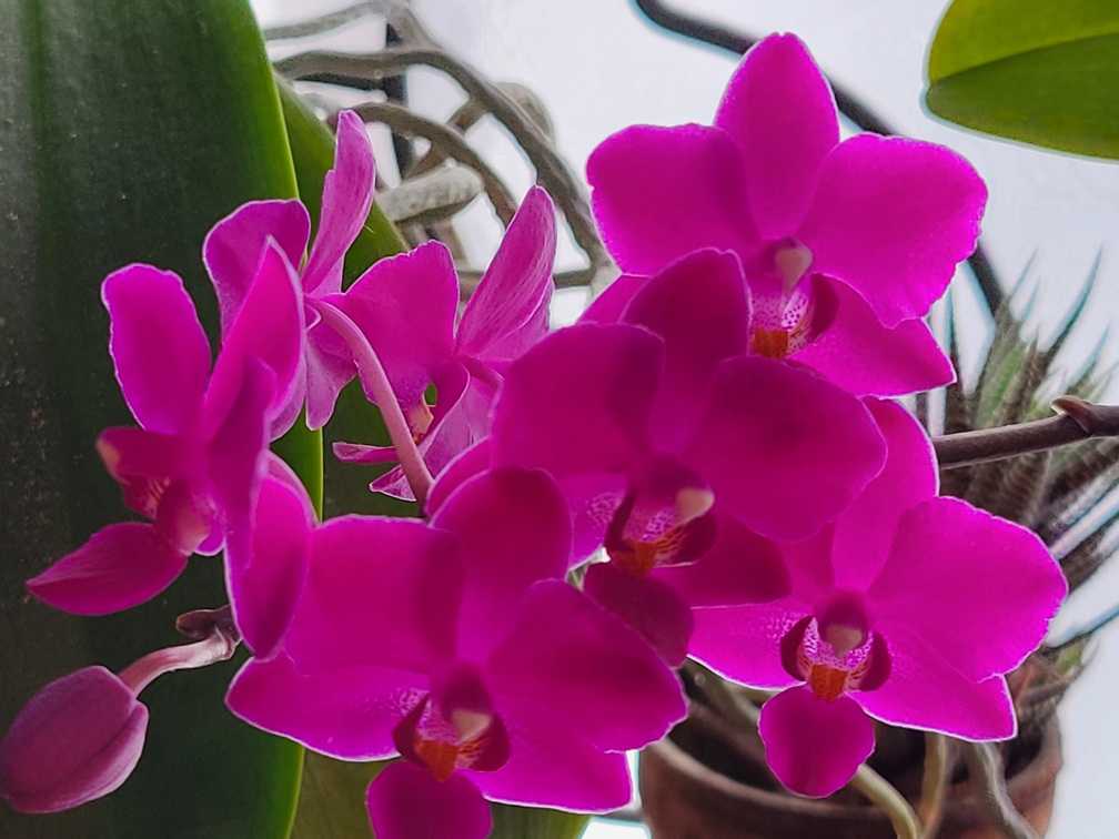 窓際の胡蝶蘭の花が咲いている。我が家では、胡蝶蘭は3月に咲き始め、8月中旬頃には全ての株が咲き終わる。なので、この一株は特別。まだ蕾もあるので10月一杯は咲き続けそうだ。寄って撮った写真を見て、改めてその色合いの素晴らしさに気が付いた。