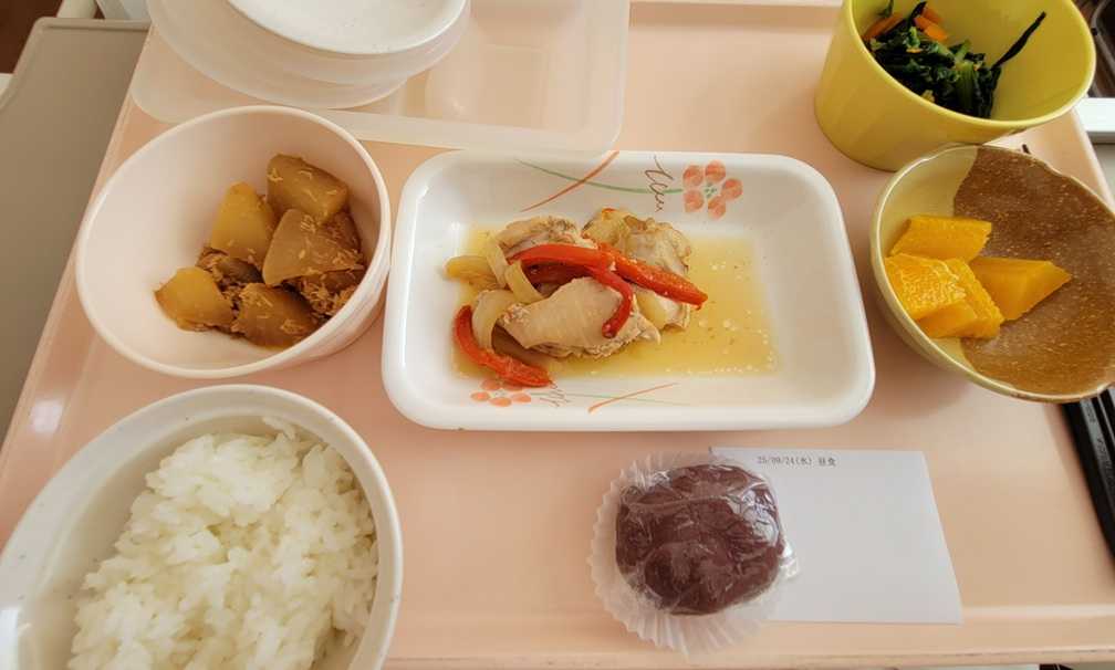 いつものメニューに加えて、おはぎが一つ添えられていた。厳しく血糖値をコントロールしている割には意外に大らかだ。病院食に味気ない思いをしている身には大いにありがたい。完食した後、最後におはぎの甘さを味わった。