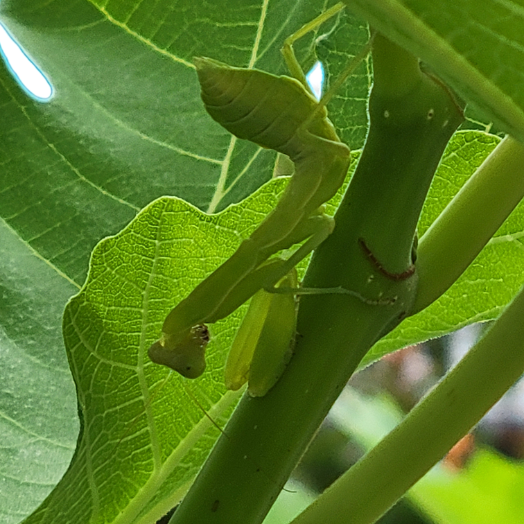 庭の無花果にカマキリの幼虫を発見。小指ほどの大きさだ。写真に撮ってよく観察しようとスマホを近づけると、無花果の葉が作る日陰に逃げ込んでしまった。で、画像のような状態となった。腹を丸めて高くしているところが面白い。鎌を完全に畳んでいるので、戦闘の意思はないようだ。顔だけをこちら向けて、睨んでいるように見えた。