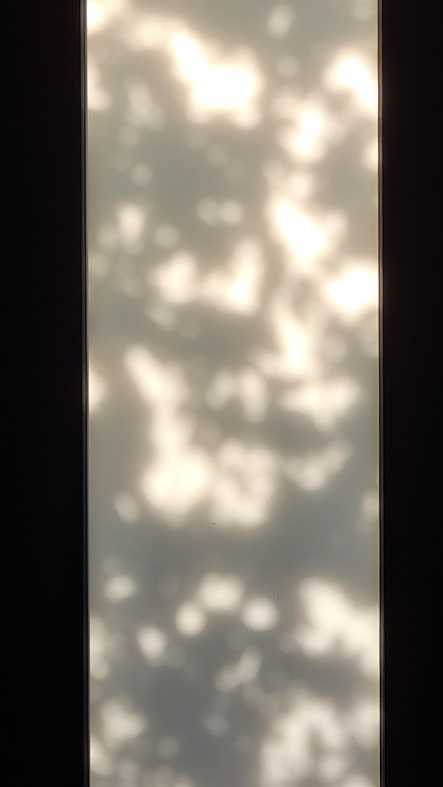 毎年今頃の時期。西日が玄関ドアを照らすと、ゴーヤで作った緑のカーテンの模様ができる。最盛期を過ぎてカーテンには隙間が増えている。ゴーヤのカーテンも間もなくその役割を終えるころだ。