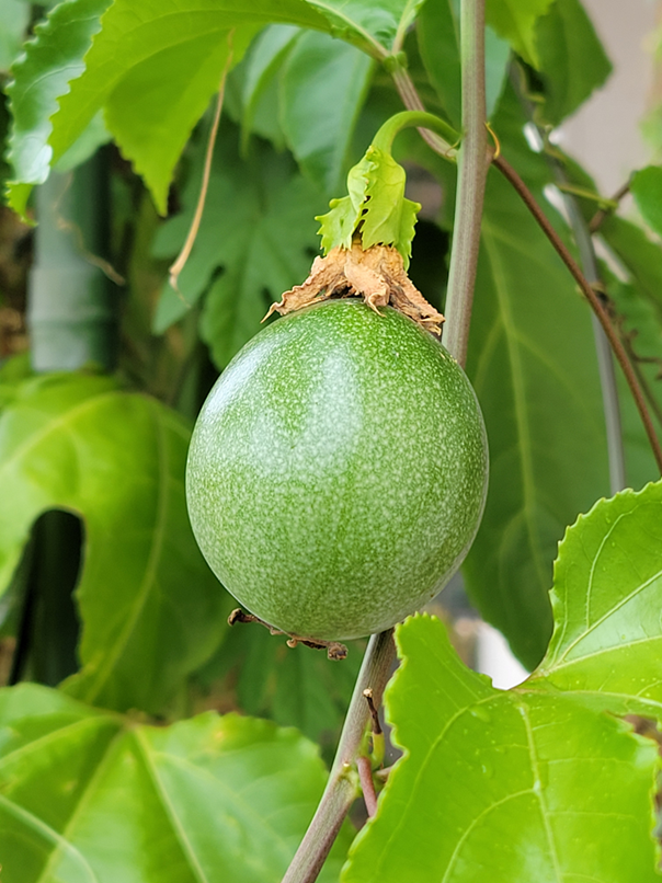トケイソウの実、即ちパッションフルーツが結実した。現在、長径約4.5㎝、短径4㎝。目の高さ以外にネットの上の方にも実っている。これまで2シーズン挑戦したものの、花も咲かなかった。理由は良く分からないが、育てる方法は毎回変わらないので、やはり元々の苗のためだろう。ネットには、パッションフルーツは夏と冬の2回収穫ができるとある。霜さえなければ完熟まで行くかもしれない。と、淡い期待を抱きながら観察している。温室のない我が家では無理とは思いながら…。