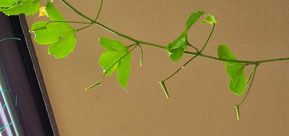 トケイソウが元気だ。玄関の庇を超えて、まだ成長している。たまたま庇の下に伸びてきた枝葉。そこには絡みつく相手がない。なので、節ごとのツルがむなしく螺旋を描いている。でもその螺旋、それなりに美しいフォルムをしている。