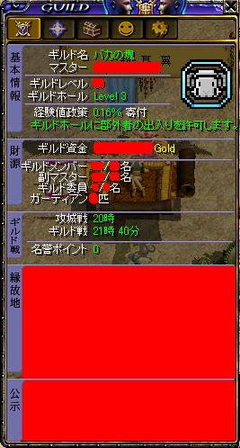ひさしぶりの更新です。もろもろの事情があって、彼女と別れなければならなくなってしまった><後、それに伴い??って言ったら変だけどGを移籍して我流Gに入隊しました。そして・・・・初攻城戦をやって来ました。Gの紋章、結構硬いですね。でもね、相手Gさんも必死らしくて、(そりゃそうだ!)相手Gメンさん倒しても倒してもリザで生き返って、来るんですね、なんで、我流GのGメンの中でレベルの高い人が、紋章そっちのけで、相手GのGメンsを倒しにいったんですねー。まぁでも、相手Gさんの紋章破壊して、ホールレベが2になりました。ワーイ。つぎは、ホールレベ3を目指して頑張りたいですね。(俺はゼンゼン役に立ってませんがw)あ、そうそう。もう2ヶ月ぐらい前でしょうか・・・・メインクエパート2終わらせました。移動がさーすんごくだるいです。ほんとにだるいです。激マゾどころじゃありません・・・ぁこれからメインクエをやろうと思っている人・・・・・覚悟して望むように(ワラそして、もう一つ。ニースが女神マスして、今+32なんですね。んじゃーね、知り合いのテイマsから女神支援手伝ってとよく言われまして、テイム手伝ったんですね、骨ファミ・・・・めっさ死にました(なんせ女神まっしぐらでレベルが120でしたからwww)塔ファミ・・・・2.3回死にました(やっぱ紙ですねww)でも、なんとかテイム成功したようで、よかったです。では、今回はこの辺でwwwwPSSS取り忘れましたが、ホールといえば、おっぱいの石像です(ワラんでね、おれが、そのネタをやろうとしたら(知り合いのマネをして)・・・先に、キ○○ンsにやられちゃいました・・・・どうやら元ネタの人、キ○○ンsの友人だそうでwではでは、今度いつ更新するかわかりませんがwwwww
