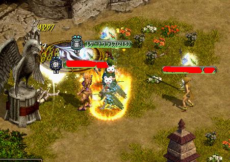 暇なので藪の中央(一般にドーナツとの愛称で呼ばれる狩場)に向かうことにしました。・・・・が、ドーナツへ行くには、ほとんどの方がご存知かと思いますが・・・・こいつがいます。MOB名はガーディアン(愛称はガー君と親しみ?を込めて呼ばれています)レベルは300弱でだいたい297-299が多いかな?タブンタイマンバトル通算成績は0勝6敗ぐらいだったと思います(200↑になってから通算成績)とりあえず、タイマンでバトってみること・・・・ガンバレ俺、負けるな!俺。そして・・・・なんと・・・・勝っちゃいました。初勝利!!!!です最初はアスヒメインで回復してたんだけど・・・・アスヒだけじゃ間に合わなかったので赤POTがぶがぶ飲んじゃいました。腹下さなければいいけど・・・ぁwそして藪のドーナッツへ行き、PTに入れてさせてもらいました~。(あくまで暇つぶしですけどwww)PS:さすが、適正かなり↑のMOBだけあって経験値は「222」とちょーまずいです><
