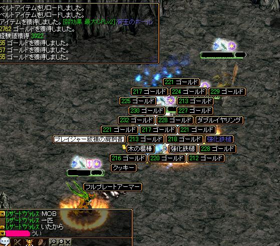 幾多の困難(ほんとか?ただ走っただけじゃねーの??)を乗り越え、河口ラの最奥と思われるところに到着。大量のMOBを狩って狩って狩りまくった。その残骸がこれだ!1・2・3(ちなみに、ワン-ツ~-スリ-と読んでホシイ・・ァ)まぁ、そんなに硬いMOBじゃないからすぐに狩りきったけどね~(実はww)2回目も、まぁーこんな感じ(ただし、2回目はここで強制落ちになってしまったがなww)そして、これが河口ラの秘密が終わった瞬間ですb