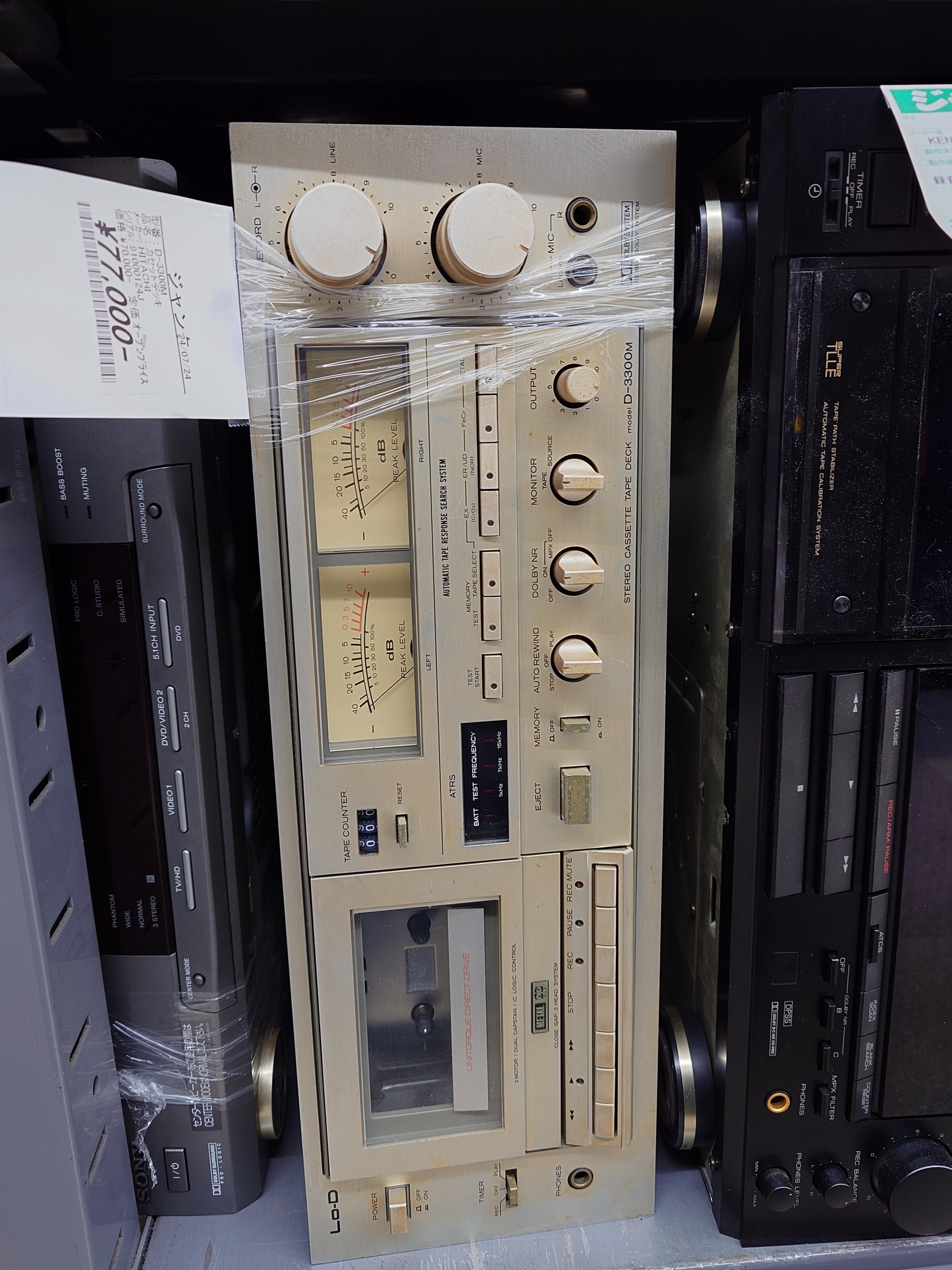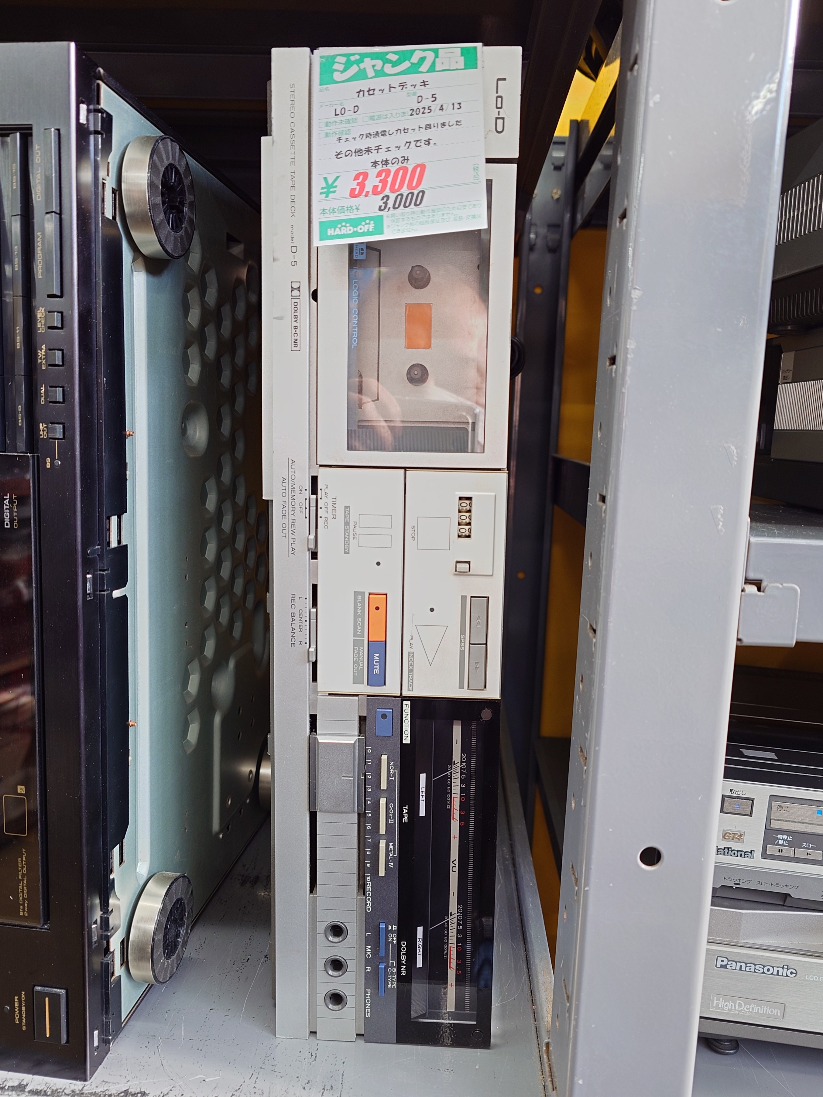 仕事帰りに立ち寄ったハードオフ箕面店にて、出会ってしまいました。Lo-D D-5メーターがFL管のD-7/8はよく見かけますが、ニードルメーターのD-5は実物に出会うのは初めてです。どうやら再生早送り巻き戻しは出来ますが、再生のピッチが速いです。嗚呼引力に逆らえずお持ち帰り。Nakamichiが我が家にはあるのになぁ、、、。