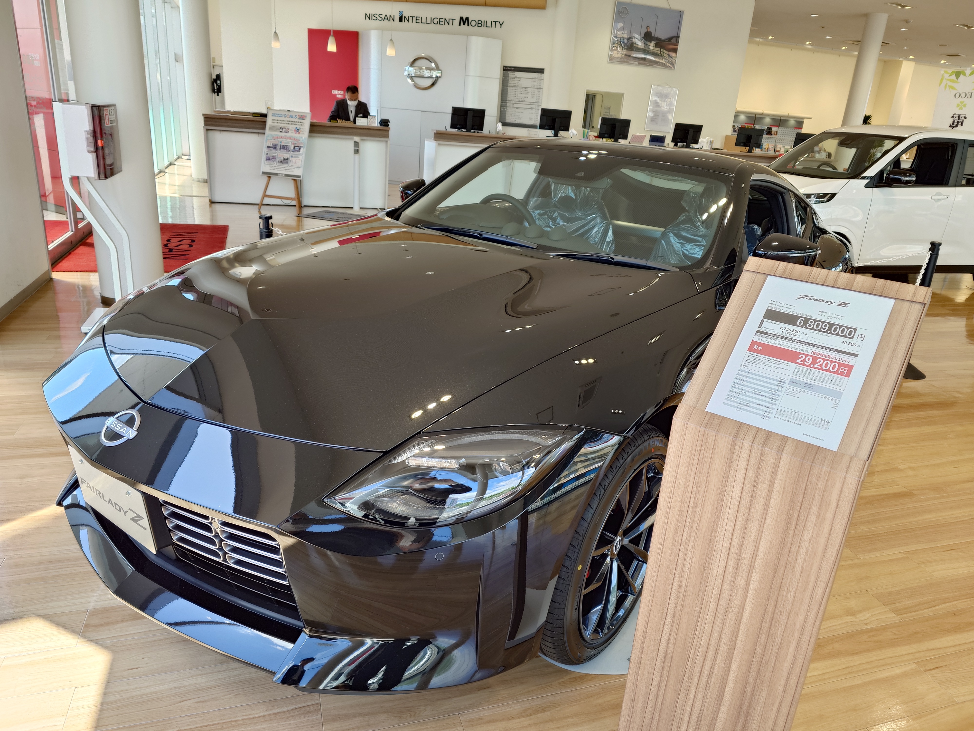 先日日産Dでオイル交換をしてもらいました。Zがショールームに置いてありました。やはりミニバンや軽ばっかりだと夢がありません。Z良いですね。洗車もしてもらいピカピカになりました。