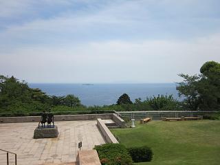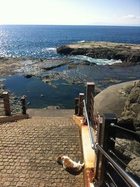 江ノ島からの海とエサをもらえず、ふてくされてる猫。