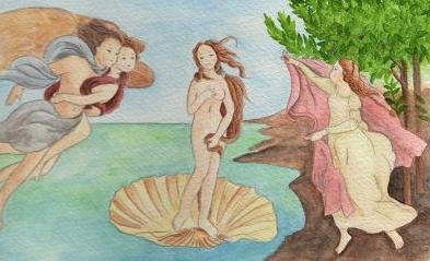 練習のため、ボッカチェリの「ヴィーナスの誕生」を真似してみました。この絵を見ると、頭の中に音楽が流れるのです。だいたい「展覧会の絵」だと思っているのですが、実際の頭の中の音楽は「ペールギュント 朝」だったりするのです。頭の中、わやくちゃです。