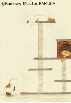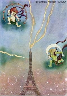 今回の柱のひとつ。柱だけあって、食いつきがよかったな~。一様に「こわい顔の風神雷神さまをユーモラスな顔で・・・」と言われたんですが、俵屋宗達の風神雷神も結構、素っ頓狂な顔をしてます。模写して初めて気づきましたが、雷神さま、実は女性?ってくらい胸があります。でも腹も出てます。あ、ちなみに塔はエッフェル塔です。東京タワーじゃないんですよ。自分でもかなり気に入っている一枚です。