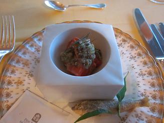 4月で仕事を辞めるときに、上司の一人からクィーンアリスのディナー招待券をいただきました。高価なものなので、もらっていいものかと思いましたが、別の上司の「あの人は、そういうこと(プレゼントすること)が好きなんだからいいんだよ」という言葉でありがたく頂戴することにしました。そして仕事を辞めて2ヶ月。やっとご馳走になりました♪前菜: グラバラックス風オーシャントラウトのマリネと稚鮎のフリット 粒マスタードで和えてあります。おいし~い♪温前菜: 紋甲イカとからすみのムーランルージュ風トマトとバーニャカウダがマッチしてtおいし~い。ただ紋甲イカがちゃんとカットされてるのに、ひっついちゃってて食べにくかった。同じく温前菜:こちらは姉が頼んだフォアグラのソテー大根添え。甥っ子がテレビでフォアグラを見るたびに食べたがるので、見せびらかすために撮ってみた。スープ: とうもろこしの冷製ポタージュ あさりのスープ カプチーノ仕立てもおいしそうだったけど、前菜・温前菜が海のものだったので、陸のものに。背後に照明があるために、写真を撮るのに被写体が影になっちゃう~。魚料理: 本日の魚介料理え~と、春巻きの皮の巾着の中にはオマール海老とホタテ。これ、すご~くおいしかった。なんのソースか忘れちゃったけど、ソースがまたおいしいの。パンにもつけて、きれいに食べた♪となりで一生懸命、姉が話してたけど、ほとんど聞いてなかったよ、味覚に集中してて。メインディッシュ: スペイン産 イベリコ豚の網焼き マスタード風味 おいしいけど、もともと肉があまり得意でない私。どうしても魚料理のほうに軍配が上がる。そういえば、メインディッシュの前に骨休め・・・じゃなかった箸休めでグレープフルーツのシャーベットが出ました。写真は撮り忘れ。デザート: クレーム・ダンジュ なんかカマクラみたいだ。マスカルポーネとヨーグルトのムースの中にカシス(ラズベリーだったかも)のシャーベット。そしてカスタードソース。ムース&ソースの甘味とシャーベットの酸味がいい感じ。でもやっぱり甘かったのか帰り道、すごく喉が渇いた~。実はメインが終わった段階で、ちょっと物足りなかったんんだけど、デザートでガツンときました。ふひ~、腹いっぱい。以前、ディナーは(金額的に)無理だからとランチに行ったことがあって、その時にいつかはディナーを食べてみたいと思ってたのです。思いがけず招待券をいただいて、今回食べることが出来ました。部長、優雅なひと時をどうもありがとうございました♪クィーンアリスの招待券をもらったことを話したら、「いつでもOKだよ!」と同伴を立候補してくれた友人のみなさま♪以上、報告でした。