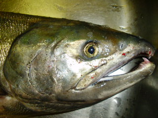 さて、釣果です。 朝4時起床で、余裕こいてコーヒーなんざ入れて一服してから出陣したんですが、行ってみてビックリ。かなりの人です。河口からちょっと離れたところに、かけ上がりがあっていいポイントなんですが、全然入る余地なしですわ。諦めムードで一番端っこでキャストを始めたんですが、4回目でHIT!!!!!マジ?????アッタモがない。すぐ隊長が持ってきてくれました。 しかもメスで、イクラゲット!!!。こりゃぁ、回遊するポイントが近いぞとキャストを続けてましたが何せ一番端。いろんなキャストをしていたらやっぱり同じポイントでHIT!!!!!今度はオスですな。こりゃぁ、いいポイントが近いと確信して振り込んでたら、あら?またHIT!!!これが重い!3号ラインで、しかもライトタックルです。苦労して近くまで寄せてみるとデカイオス。タモを見て思い切り走られたら・・・・・・・・・・ブチン。ルアー1個消滅・・・・・。めげずに振り込んだんですが、9時半になり腹も減って終了。河口近くは、かなり釣れてるみたいですな。しかもポイントの前にテントを張って明日も駄目そう。まぁ。2本釣れたしいいか。さて、昼過ぎの3時に再度行くとキャストしてる人は1人。河口近くに入れるじゃぁないですか。でも、魚影ななし。こりゃぁ朝のポイントのほうがいいですな。キャストすること15分。HIT!!!しかも重い。今度はドラグを何度も調整しながら、時間をかけます。50Mくらいラインを出されては巻いてと20分。ようやくゲットです。60CMのオスです。それを見て、みんなキャストしだしたんですが、何で日中はやらないんだろ?回遊魚だからチャンスはあるはずなのに?ところが河口近くで、みんなガンガン釣り始めました。悔しいので、近くまで様子を見に行くと・・・・・・・・・・引っ掛けです!全部腹とか背中に掛かってますもん。これじゃぁ警戒してルアーじゃ釣れるはずありませんな。誰かが通報したのかK察が来たんですが、釣り人全員に引っ掛けは駄目だと言いながら帰りましたわ。この役立たず!!!と思いながら、やる気0でやめました。夜にオスを1本食べたんですが、犬達も喜んで食べてましたよ。帰ってからは真空パック。メスと比べると大きさが全然違いますな。真空パック機の調子が悪くなってきました。空気が若干残ったりするんですな。今年は真空パックする魚も少ないので不自由はしてないんですが・・・。今年も3本釣れてよし!なんですが、あれを見ちゃうとやる気なくなりますな。来年はどうしようか?そんなに遠く感じなくはなりましたが、一生懸命ルアーやって、まったく釣れてない人もいる中、がっかりですわ。河口から上がって川の中の釣りも禁止なんですが、純粋に勝負して釣るのはいいと思います。見つかれば逮捕なんですが、僕の中ではOKなんです。でも、引っ掛けは駄目でしょう。というわけで今年の知床のキャンプも終了でした。さぁ、鮭のシーズンですね。場所取りが大変ですが、今年も頑張りましょう! せば!!!!!