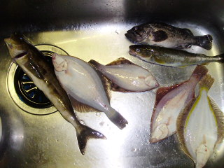 釣りの日記がアップ出来ずにいたので、回想録で(笑)20日の朝から21日の朝まで、またもやぶっ通しの仕事でした。今回は早く5時に終了だったんですが、鮭釣りの用意しとけばよかったと後悔です。が、帰ってからどうしても釣りが頭から離れないので、ホッケ釣りに岩内へ。情報では大荒れだったんですが、現地はとんでもない荒れ様です。それでも竿を出さないとならないのが釣り好きの悲しい性ですな。遠投用の竿をもう1本買ったのですが向かい風ですし、飛んで20Mくらい(笑)1本はコマセ籠ぶら下げて、ちょい投げ。強風で立っていても風でふらつくくらいなんですが、カレイが釣れます。そればかりか、変なXファイルに出てくるようなのも釣れましたよ。ビックリでした。そういえば、春にカレイ釣りに行ったらホッケばかりだったんだよなぁー。今度はホッケ釣りでカレイばかりかい!あまりにも強い風で、場所をちょっと移動して向かい風を横風にしてみましたが、同じくカレイばかり。夕方になると、小気味いいアタリが・・・・・・・コマイでした。すぐに違う竿にもアタリ・・・・・念願のホッケ。いよいよ来るかー・・・・・・・・・これっきりですか~。ソイも1匹追加して終了ー。眠いんだもん。カレイもいいのだけキープして、小さいのはリリース。で、こんな釣果。デジカメ忘れて、こんな写真しかありません。で、へんな魚類。エイリアンでした。強風でゴミかと思い、ちょっとずつ上げたらビックリ。放置してタモ取って、また格闘の末上げました。全長で1M弱。隊長は嫌いなので、実家で持って行きました。捌き方もわからないので、苦労したらしいです。ホッケ!ホッケ!が欲しいんです。抱卵ホッケ!欲求不満で、眠気も覚めて帰宅しました。チクショー。せば!!! 実は、23日・・・・・・・にホッケ釣りにまた行きました。