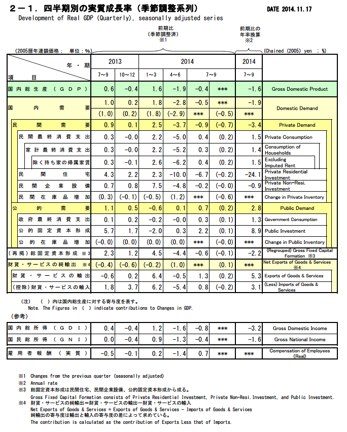 ★ 内閣府経済社会総合研究所国民経済計算部 (昔の名前は「経済企画庁経済研究所」)から 17日にGDPの「一次速報値(=Preliminary Estimates)」が公表された。 来月8日に公表される「二次速報値」とは異なり、 「一次速報値」は経済動向を把握するための GDP四半期推定法(Quarterly Estimation QE)によっている。 「QE法」は各省などで発表された名目額数値指数、物価指数などの 経済指標を推計に利用している。 もちろん、各種の指標を合成するWEIGHTは産業連関表などで 組み上げられるかも知れない。 国民所得統計手法と、推計手法などの総力を挙げての QE法がそこにあり、外部機関には不可能であろう。 この時期には、四半期(3ヶ月)の月次DATAがほぼ3ヶ月分まで 入手されている。 しかし、まだ国民所得推計に必要な未発表の1ヶ月分は一部存在するが、 何らかの方法で推定機関が補完しなければならない使命を負っているのが QE法なのである。 昔はまるまる1ヶ月が不明のデータがあったが、 現在は月次データの大半は翌月末に発表される場合が多いから、 コンピューター化様々である。 大抵の月次データが入手可能となったのは、 各省にまたがっていた統計の一部が内閣府統計局に集約されたことも スピード化に貢献している。 3ヶ月分の数値が全て入れば速報値と確報値の相関係数は 限りなく1に近い。 一次~二次の速報値の信頼性はほぼ完璧に近づいている。 呆け頭の言うことだから、間違っているかもしれないが・・・ ★ 7-9月の実質GDP成長率(季節調整済み四半期率)は 内需寄与度が▲0.5%、外需寄与度が1.0%で 差し引き▲0.4%となった。 寄与度を部門別に見ると、民間消費支出は0.2%、民間住宅▲0.2%、 民間企業設備▲0.0%、民間在庫品増加▲0.6%、政府最終消費支出0.1%、 公的固定資本形成は0.1%、公的在庫品増加▲0.0%、輸出0.2%、 マイナス項目の輸入▲0.2%で、トータル▲0.4%であった。 ・・・ 昨年の7-9月からの推移を四半期率で見ると、 0.6%→▲0.4%→1.6%→▲1.9%→▲0.4% と 消費再増税後の反動減が2期続いている。 ★ 7-9期の名目GDP成長率は、内需寄与度および外需寄与度が共に▲0.4%で 併せて▲.8%となった。 寄与度を部門別に見ると、民間消費支出は0.2%、民間住宅▲0.2%、 民間企業設備▲0.0%、民間在庫品増加▲0.7%、政府最終消費支出0.1%、 公的固定資本形成は0.1%、公的在庫品増加▲0.0%、輸出0.5%、 マイナス項目の輸入▲0.8%で、トータル▲0.8%であった。 ・・・ 昨年の7-9月からの季節調整済み四半期率の推移は 0.4%→0.1%→1.5%→▲0.1%→▲0.8% と低迷している。 ★ 7-9期デフレーター(季調済み四半期率)は▲0.3%(前期1.8%)、 国内需要デフレーターは0.1%(前期1.4%)、 輸出デフレーターは1.4%(前期▲0.1%)、 輸入デフレーターは3.5% (前期▲1.6%)であった。 昨年7-9期からの推移は▲0.2%→0.5%→▲0.1%→1.8%→▲0.3% である。 ★ 実質GNI(国民総所得)の 季調済み四半期率は、昨年7-9期から 0.0%→▲0.4%→0.9%→▲1.3%→▲0.4%、 名目GNIの推移は 0.1%→0.2%→1.2%→0.1%→▲0.3%である。 ★ 実質ベースの雇用者報酬の 季調済み四半期率は、昨年7-9期から ▲0.5%→▲0.1%→0.2%→▲1.4%→0.7%、 名目ベースの雇用者報酬の 季調済み四半期率は、昨年7-9期から ▲0.2%→0.8%→0.0%→0.9%→0.8%であり、 名目では伸びているが、実質では伸びてはいない。 ケインズが言うように、雇用者の賃金が上昇するのは かなりのラグがあるのである。 学者達はラグがあることを知っているから、いずれは上がると先読み しているようだが、その他の指標は考慮していない。 セテリス・パリブス(Ceteris paribus)の世界で論評しているに過ぎない。 怖い誘導である。 本当に学者なのだろうか? 政治家なのかも知れない! ★ <内閣府国民所得統計7-9期は一次速報> <読売新聞> ★ 解説する経済学者は、意見を言うことが仕事であって、 真実を述べているわけではないようだ。 真実が言える理論厚生経済学者は招かれていないようである。 ノーベル経済学賞候補でもある方の意見はどうだろうか? アベノミクスのバックボーンであるはずのハマコーさんは もっとハッキリと見解を述べて貰いたいものである。 ★ 消費増税は仕方がないとしても、 年金生活者にとってはその前に生鮮食料品などの 生命線となる支出について「消費税非対象」の宣言を 期待するものである。 ★ 余計なことであろうが、QEをQuarterly の後を、 Estimation か Estimates か尋ねている方がいる。 呆けの小生は、統計的推定法を言うときはEstimation であり、 その方法で推定した速報「推定値」はEstimates であると思うが、 どちらでも良いのであろう。 呆けの小生は、当初、QEを Quick Estimation と思っていた。 QEは、つまり、確報値のような積み上げではなくて、 確報値との相関関係の強い国民所得の構成要素などの 各種の指標を結びつける統計的手法で四半期(=Quarterly)GDPを Quickに推計するのが「QE法」ではないだろうか? ★ 「QE」を米国の「量的緩和政策(=Quantitative easing)」と読む方もいれば、 小生のように「クイーン・エリザベス(=HMS Queen Elizabeth)」と格上げ