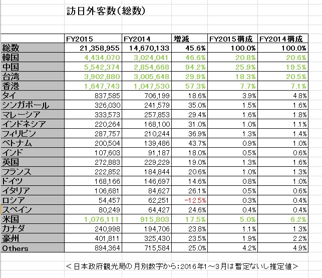 ★ 小生の計算が間違いなければ、FY2015の訪日外客数は日本政府観光局(JNTO)による数字は21百万人を超えている。/// FY2014では国別では1位韓国20.6%、2位台湾20.5%、3位中国19.5%4位香港7.1%、5位米国6.2%であったが、FY2015では中国が対前年度比94.2%も伸びて1位で25.9%を占め、韓国は対前年度比46.6%伸びて2位で20.8%、台湾は対前年度比29.9%伸びて3位で18.3%、香港は対前年度比57.3%伸びて4位で7.7%、米国は対前年度比17.5%伸びて5位で5.0%をそれぞれ占めた。/// ほとんどの国が増加したのに比べてFY2014には0.4%にすぎないモノのロシアは対前年度比▲12.5%となり、シェアは0.3%に留まった。 /// 継続的な訪日旅行プロモーション、航空路線の拡大、クルーズ船寄港増大、燃油サーチャージ値下がりなどが後押ししていると見られている。/// また、このところの海外でのイスラム国自爆テロなどでの事件が多発し、治安が比較的安全な日本での観光を選好する気風もあるかもしれない。 日本は八百万の神を信ずるために、あらゆる宗教の観光客を受け入れる慣習があり気候も変化に富み、歴史がある国であるなどでユニバーサルな観光国として世界から注目されるようになった。★ 以下は、JNTOの公表している数字を「年度ベース」に加工し直したモノである。 ★ 火山国日本は富士山はじめ多くの美しい山並みと、温泉保養地を誇っている。 しかし、火山国というモノは地下にはマグマが蠢き膨大なエネルギーを抱えている。 火山のエネルギーは熱源でもあり、今後の発電にも利用されようが、自然災害としての地震活動の根源でもあり、過去の火山爆発で火山皪が堆積した地層には不安定要素を抱えている。 現在の熊本地震が火山国日本の厳しい面を見せているが、訪日外国人はこの地に住むのではないことから日本全体での観光面での打撃には至っていないようである。 むしろ、中国などからの観光客は、日本の建造物が中国のような煉瓦造りではなく耐震性を考慮した構造を持っていることに驚いているようだ。(熊本地震では群発多重激震のため倒壊に至っているが・・) ★:::::::脱線::::::: 宇宙を超高速で回転しながら飛び続ける「宇宙線・地球号」に乗船している地球人にはプレートが動く(地震発生)ことは自然の動きである。 地球が約46億年前に誕生したことは判っているが、人間ホモ・サピエンスの誕生はわずか約20-19万年前に過ぎない。 地球の磁場は10-100万年くらいで不規則に逆転しているという。現在の暦は現在の地球の自転・公転をなぞったモノに過ぎない。紀元前4000年頃にエジプトでシリウス・ナイル暦が作られた。マヤ暦は紀元前3114年を基準日としている。 ユリウス暦は紀元前46年、グレゴリオ暦は1582年に制定された。 第九の惑星(公転1-2万年)が発見されたが、その役割(地球への影響など)は解明されていない。呆けの小生には、現在の地球の自転・公転と太陽の関係を現す暦から見て、 第九の惑星が暦に大きな影響を与えているように思う。 だれか解明してくれないだろうか?/// 現実の人間生活の動きの反映である政治に左右されないで科学が地球の神秘に触れている分野をWebで知りたいモノである。脱線した・・ ★ 気がつけば後日補記する。