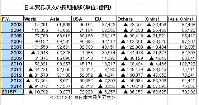 ★財務省から2016年3月の貿易収支速報が公表された。具体的に理解するために整理してみた。 /////////////////////////// 数字が現実経済を説明する/////////////////////////// ★・日本貿易の収支尻(輸出-輸入)の推移の地域別分析 <中国は日本にとって最大の貿易赤字国化?へ> ★ ★ ★・月別貿易収支尻 ★ ・FY2015の対前年度増減では「石油輸入(ウエイト10%)」が4.5兆円減、「その他輸入(同90%)」が4.1兆円減少している。いかに、石油輸入の減少寄与が大きいかが判る。 <輸入全体の減少のうち、「原油減少」が52.2%、「その他輸入」が47.8%を占める。> ★