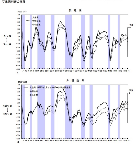 ★ 今日は日本銀行の全国企業短期経済観測調査(日銀短観)が公表された。 <業況判断の推移:日銀短観2016.3より> 短観は、企業の景気動向を把握するために全国約1万社について四半期ごとに、例えば業況判断をDI=Defusion Indexとして、業績状態が「良いと答えた企業割合」ー「悪いと答えた企業割合」を差し引いた値を公表する。(もちろん、季節調整などを行った後の数字。) /// ・全規模・全産業では前期(2015.12)の9から7に (先行き見通し 3から1に)、 ・全規模・製造業では、前期の4から1に (先行き見通し 1から▲3に)、 ・全規模・非製造業では、前期の13から11に (先行き見通し 7から4に) 企業判断は悪化している。★ 日銀が「量的・質的緩和」に踏み切った頃の2013.6以来の低水準となった。最近のマイナス金利という経済理論では未知の領域にまで踏み込んだ日銀(というより半数は反対、総裁が賛成)であったが、原油市況の超低迷、中国経済・新興国経済の停滞などには効き目が無かった。 逆に、日本経済のアキレス腱とも言われる日本の巨大な国債残高にマイナス金利が有利に働くことが注目されたかのように円高となっている。この円高効果が企業家の心理を冷え込ませた一因であろう。 消費者には、マイナス金利は将来に備えて貯蓄が生きてこないという危機感情を与えることとなり、消費を切り詰めてタンス預金で切り盛りする工夫を講じることになったかもしれない。 日本経済のGDP項目の最大を占める個人消費需要が冷え込んでおり、企業家の業況マインドは弱まっている。大企業・製造業で見ると、DIは鉄鋼業(▲22)、石油・石炭製品(▲16)、電気機械(▲7)、繊維(▲3) はマイナスの値であり、DIの「悪化度合いの大きい業種」は、鉄鋼業、化学、生産用機械、造船・重機など、電気機械、自動車、素材業種などである。 <上記の表が小さくて見辛いので画像を右クリックし、 「新しいタブで画像を開く(I)」を選択し、右上に現れる「タブ」 をクリックして表をご覧ください。> ★ 本来は、通貨の要である日本銀行は本来は、銀行に対して「Lender of Last Resort」に留まるべきである。マイナス金利政策は、銀行が「貸し出し姿勢」に転じるように期待して、銀行の日銀当座預け金の一部に罰則的な金利を設定するものである。銀行は、企業審査を通じて融資を行うのであるから、資金需要のある企業の業績・将来的見通しを判断して融資する。預金が増えたからと言って、貸し出しを多くすると、貸し倒れが多く発生するから、金利どころでなくて元金さえ失う畏れがある。銀行はそれほど単純な事業体ではない。 ★ もともと優良企業を中心に金余り状況にある現在(Liquidity Trap)には、マイナス金利では金融緩和の効果は生まれない。マイナス金利政策では、国債の急騰を生んでいる。/// マイナス金利は、債務体質の国家にはプラスである。特に、日本のように債務も多いが債権が遙かに上回る対外純資産国では、債務支払い金利が軽減される。マイナス金利だと債務負担は有利に働くかもしれない。 長期金利水準の要となっている国債の急騰は長期金利、短期金利などの低下を随伴している。 マイナス金利政策で有利となるのは、ローン(住宅、自動車など)を抱えている国民である。★ マイナス金利政策は、ただし、将来の割引率がマイナスという、国民や企業の将来の期待収益率にもマイナスという効果を生まないだろうか。個人購買意欲、企業家マインドなどには、金利低下よりも、将来の期待収益が大切ではないだろうか。★将来の期待収益が高まるような財政出動が早期に期待される。ミセスワタナベを喜ばすような政策でなく、企業家精神を高揚させるような財政出動を期待したい。今日は「エイプリル・フール」なので呆けにも発言の権利があるだろう。★ ただし「馬鹿も休み休み言え」とも言うから、" Stop talking nonsense; don't be ridiculous; give me a break " 呆けは、すこし休もう(So,I'll take a break)・・・★ 呆けついでに言うと、DIは「良い企業割合」マイナス「悪い企業割合」であり、変化については際だつモノである。 しかし、どちらでもない中間を考慮していないように思う。[DI/中間割合]では相関関係はないのだろうか?「中間の動向」を如何に反映させるかの工夫はないモノであろうか。例えば、See-Saw「シーソー」 の中間点になぞらえて長さ(中間の割合)と左右(DIの対象)の重さを考えよう。中間からの長さでも左右の重さの重要性は違ってくる。このような場合は中間値は、その1/2なのだろうか、その'ルート'の1/2なのだろうか、'Log'の1/2か何かなのだろうか。考えても意味がないのだろうか。だれかシミュレーションをお願いしたいモノである。 脱線である。★