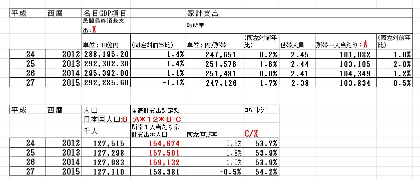 ★ 今日も早朝テニスがあり、その直後に地域スポーツ振興テニスがあったが、疲れすぎたので後者は30分ほどで切り上げた。★ 現在、呆けの小生がWebでみることができる「家計調査家計支出」と、「GDP(=GDE)項目の個人消費」との関係を探ってみたい。///////////////////////////// GNP項目の個人消費支出を家計調査の「家計支出・総所帯=二人以上所帯+単身所帯」と比べてみる。家計調査では「所帯当たりの家計支出」が計上されているから、素人の小生は、それを「所帯当たり人員」で割り、それに「国民人口」を乗じてみる・・・。(2012年以前には統計方法が異なるから考慮外としている。)国民の「家計支出額想定」(=C)は「名目GDP項目の民間最終消費支出」(=X)に比べて、ほぼ 54% の「縮尺率」を2012~2015年期間に保持している。もちろん、GDPの推定においては単純に家計調査だけを利用していない。「住宅設備修繕支出」を「帰属家賃」、「乗用車支出」を「乗用車新規登録台数」、「自宅への家賃」を「帰属家賃計上」などといった別の角度からの推計もある。逆に家計調査で「消費支出」に計上されている「移転支出」 である「贈与金・仕送りなど」は国民経済計算上は除外されている。/// 呆けの小生の推論は本来的には、正しいとは言えないだろうがセカンド・ベストであって貰いたいモノである。/// (図表が読み辛い場合は、右クリックして「別のタブで画像を開く」を選択し、 上部の新しいタブをクリックして見てください。 Cの単位は10億円です。2015年は推定値。人口は期末値を採用した。 世帯構成概念が違い、家計調査の母集団をそのまま国民経済計算概念に 応用するのはかなりに無理があります。あくまで、参考に・・・) ★以上は年間ベース、年度ベースの推計には使えるかも。しかし、月別や、四半期別となると「総所帯」の統計はいまだ完備されて居らず(?)、「二人以上所帯=勤労所帯、無職所帯」が利用可能である。 「所帯」なのだから、「所帯人員」が変動するとそのままでは使用できないから、1人当たりに修正して伸び率を見てみる。ここでは短期間だから人口増減の差は無視する。「二人以上所帯の家計調査」家計支出と「四半期GNP項目個人消費支出」はほぼ方向性は合っているようである。つまり、CY2015の消費活動はかなりの「マイナス」であったことは間違いないようである。つづく、2016.1~3の消費行動も「マイナス」が継続している、ようだ。 ★ 日銀の「マイナス金利政策」で、将来を見る国民の目は、悲観的な感覚が強く印象的に植え付けられているのではないだろうか。 折角の原油安という日本経済へのカンフル剤もこれを価格抑制という欺瞞的な解釈で片付けては可愛そうである。 度重なる消費税引き上げでも陰鬱な気分である。 /// ギリシャ政府の欺瞞的な対EUへの弁明は、ギリシャ国民の陰鬱な気分を覆い隠しているようだ。 日本政府もギリシャ政府のように頭の良い弁明を構築すべきであろう。 /// マイナス金利政策&「年金の株式運用枠拡大」などは、悪く解釈すると株式市場への日銀の「ある種の補助金」に相当するかもしれない。米国財務省が厳しい目を日本の金融政策に向けている。為替政策は世界から厳しい批判を受けるが、限度を超えた「マイナス金利」は一種の特定セクターへの補助金に相当するかもしれない。日本の財務相はうまく米国務相を煙に巻くことができるであろうか。トランプ氏はまだ気がついていないかも知れない。/// 対外純資産で世界一を誇る日本の潜在能力を知らない人は世界にはいないはずである。 ★呆け頭の余計な心配であればいいが・・・★ さて、自由が丘氏に「米国 New York 旅行報告」の原稿を依頼しているが、執筆先・軽井沢から届き次第に報告したい。 小生は、この連休は「土日祭日の早朝テニス」で目が回る忙しさであるから、ブログも途切れがちになると思う次第。★ ・参考4月の月例報告(経済財政担当相) 基調判断報告前月からの変化 景気 このところ弱さもみられるが、緩やかな回復基調が続いている 据え置き 個人消費 消費者マインドに足踏みがみられるなか、おおむね横ばいとなっている 据え置き 設備投資 持ち直しの動きがみられる 据え置き 輸出 おおむね横ばいとなっている 据え置き(貿易・サービス収支については「黒字」は増加傾向にあると強調している。) 生産 横ばいとなっている 据え置き 企業収益 非製造業を中心に改善傾向にある 据え置き 企業の業況判断 慎重さがみられる 下方修正(一部に慎重さが増している、も消えている) 雇用情勢 改善している 据え置き 消費者物価 緩やかに上昇している 据え置き 先行き 雇用・所得環境の改善 が続くなかで、各種政策の効果もあって、緩 やかな回復に向かうことが期待される。ただ し、海外経済で弱さがみられており、中国を 始めとするアジア新興国や資源国等の景気が 下振れし、我が国の景気が下押しされるリス クがある。こうしたなかで、海外経済の不確 実性の高ま