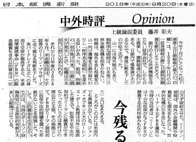 ☆親愛なる諸兄へ from Mr.Tsunami 前略 本日の日経朝刊6頁コラム「オピニオン」に、日本経済新聞上級論説委員:藤井 彰夫氏(昭60年早稲田大学政治経済学部卆)が日米の金融政策の相違について、日銀の山一證券 破綻に対する対応と、米金融当局のリーマン・ブラザーズ 破綻への対応の仕方の相違、および、その後の今日に至るまでの影響を論じていますので、既にお目通しのこととは思いますが、念の為、ここもと添付送信します。 以上、閑話休題まで。 草々 ・・・ 記 ・・・☆Mr.Tigersからの感想: 本日の日経記事 興味深く 熟読しました。金融機関でバブル崩壊を経験した私は 日本的な処理が必ずしも良くなく その後の回復を遅らせたように思います。ただ 日本の良き伝統 文化 社会が このような解決方法しか取れなかったようにも思います。アベノミクスの出口が見えないまま 財政赤字は膨らむばかり。。。☆・・・参考・・・1.コトバンクから「中外」=中外の用語解説 - うちとそと。2.「中外時評」日本経済新聞の沿革WIKIPEDIAから1876年12月2日:三井物産の発行する「中外物価新報」として創刊。週刊。1885年7月:日刊化(日曜日・祝日の翌日は休刊)。1889年1月:「中外商業新報」に改題。1905年:解散、野崎廣太の個人事業として、存続。1920年1月:ニューヨークに特派員事務所を設置。1924年10月:夕刊を創刊。1942年11月1日:政府の新聞統合令により、東日本の経済紙を統合して、「日本産業経済」に改題。1946年3月1日:題字を現在の「日本経済新聞」に改題。1966年12月:創刊90周年。1996年12月:創刊120周年。2007年1月1日:創業130周年記念を機に、英称を「The Nihon Keizai Shimbun」から「The Nikkei」に改称。2010年3月23日:電子版創刊2015年7月23日:英経済紙フィナンシャル・タイムズを約1600億円で買収。FTの日本語翻訳版を配信し始める。2017年3月4日:この日から土曜日付と日曜日付の1面レイアウトをリニューアル、土日のみ(土曜日は夕刊も)、題字が横組み(字模様はなし)に変更される。日曜日に本編中盤に16ページの折り込み型日曜版として「NIKKEI The Style」の連載を開始。同日曜版は、他のページよりもカラー写真やグラフィックを重視するため、他のページから抜き取りしやすいように高級白色紙を用いている。