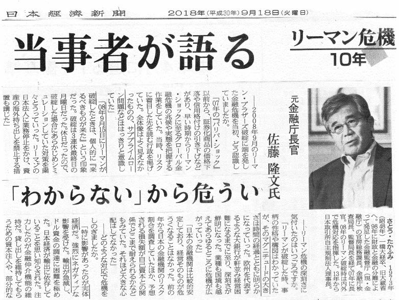 ☆親愛なる諸兄へ前略 2008年のリーマン・ブラザーズ破綻を起点とした金融危機から今年で10年ですが、日経新聞は「リーマン危機10年」と題し関係者へのインタビュー記事を掲載、本日は元・金融庁長官(2007~2009年) 佐藤 隆文氏(一橋大学経済学部荒憲治郎ゼミ昭和48年卒)が登壇していますので、既にお目通しのこととは思いますが、念の為、ここもと添付送信します。 草々 ・・・ 記 ・・・☆