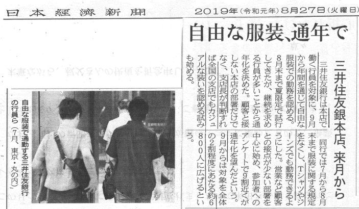 ☆賢明なる諸兄へ from Tsunami氏 前略 日経朝刊に目を通していたら、三井住友銀行の行員の服装が自由になる、との記事が目に止まりましたので、念の為、ここもと添付送信します。 同行では、8月末まで夏限定で自由な服装での勤務を認めてきましたが、アンケートの結果、9割近くが通年化を希望していることから9月以降もこれを継続することとし、対象を全体の2割程度にあたる約6800人に広げるそうです。 世の中、いろいろ変化するものですネ!…。以上、余談まで。 草々☆☆・☆<めいてい君の追加> 1.寄稿者のファイルは「PDF形式」 なので 画像を「Fn」+「PrtScr」した後、 「ペイント」に張り付けて「整形」 「JPG形式」に変換してあります。 2.*文字が見辛い方は、(1).PCでは 「CTRL」+「+」を押して拡大 できます。 3回で十分です。 あとで、「CTRL」+「0(数字)」を 1回押して、元に戻してください。(2).スマートフォンでは、 二本指で拡大できます。(3).「HAZUKI ルーペ」なら問題なし。☆以下はいつものように寄稿者のファイルは「PDF形式」 なので Tracker社のPDFXCViewerなどで 「JPG形式」に変換してあります。☆やはり、お客としては、小生などは制服が気持ちいいのだが・・・☆<WEB画像>☆