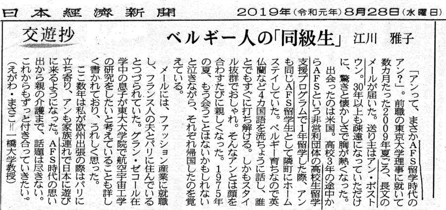 ☆賢明なる諸兄へ from Tsunami氏 前略 一諸兄より、「のメールに添付される画像ファイルは、手元の携帯電話の画面では豆粒程度にしかならず、天眼鏡でもない限り判読困難」との電話を頂戴しました。 受信側の事情を全く弁えず、自分勝手に配信してきたこと、お詫びします。 しかしながら、弊メールの添付記事は、殆ど日経新聞に依拠していますので、もしも添付に関心をお持ちでしたら、出典の日経新聞も参照願いたく、勝手申し上げますがご了解のほど宜しくお願い申し上げます。 ということで、ここもと添付した、日経朝刊コラム「交遊抄」に登壇した一橋大学江川雅子教授(昭31生~、昭55東大教養、昭61ハーバード大院、平18一橋大商学研究科)のAFS留学時代の友人にについて語っている「記事」も、豆粒程度の画像になっているかと思いますが、ご容赦下さい。 ネット検索によると、AFS(American Field Service)留学制度は、悲惨な戦争による傷病兵の救助活動にはじまり、その後、戦争を起こさないための活動へと転じ、さらには高校生の留学制度が発足した、とのこと。 日本も、昭和29年からこの留学制度に生徒を派遣しているそうですが、大変懐の深い制度だ、と思います。 以上、閑話休題まで。 草々☆☆・☆<めいてい君の追加> 1.寄稿者のファイルは「PDF形式」 なので 画像を「Fn」+「PrtScr」した後、 「ペイント」に張り付けて「整形」 「JPG形式」に変換してあります。 2.*文字が見辛い方は、(1).PCでは 「CTRL」+「+」を押して拡大 できます。 3回で十分です。 あとで、「CTRL」+「0(数字)」を 1回押して、元に戻してください。(2).スマートフォンでは、 二本指で拡大できます。(3).「HAZUKI ルーペ」なら問題なし。☆ Dr.Tsunamiの友人の携帯電話は画像拡大のできる小生のスマートフォン(アップル社のiPhone)ではないようです。 ☆めいてい君の知人では、AFS留学生では「外交官になったO氏」がいる。☆<WIKIPEDIA>☆