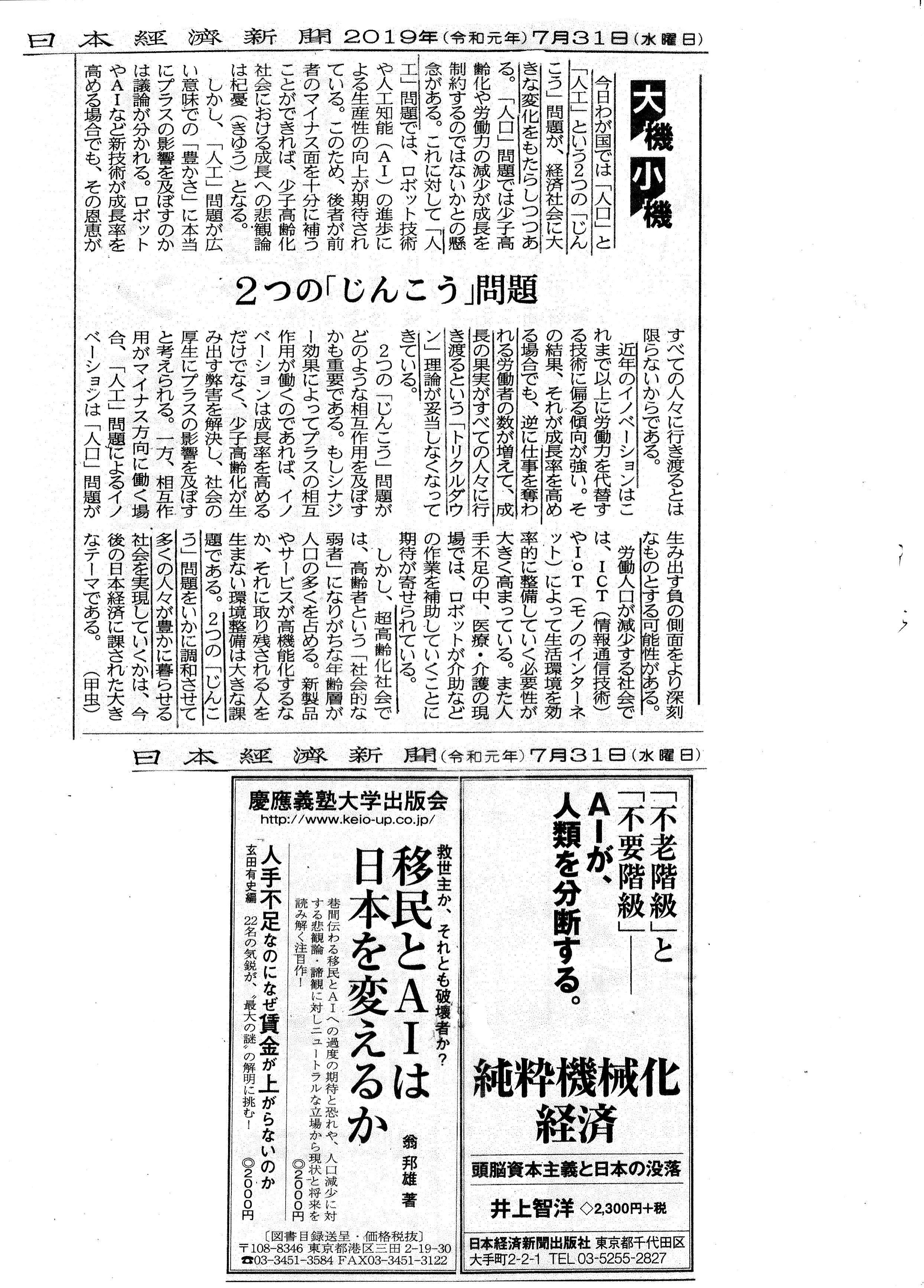 ☆賢明なる諸兄へ from Tsunami氏前略 先月末日の日経朝刊コラム「大機小機」は、わが国で「人口」と「人工」という2ツの「ジンコウ」問題が経済社会に大きな変化をもたらしつつある、と論じていますので、既に読了済みとは思いますが、念の為、ここもと添付送信します。 労働人口が減少するわが国は、ロボットやAIなど新技術によって労働力が代替されるようですが、他方で海外からの移民労働を受け入れる声も聞こえはじめています。 しかし、いずれ将来の移民労働者の高齢化も取り沙汰されるようになるのではないでしょうか?…。 根は深いですネ!。 以上、閑話休題まで。 草々<文字・画像拡大方法は下記*>「CTRL」+「+」を3回押してください☆・☆<めいてい君の追加> 1.寄稿者のファイルは「PDF形式」 なので Tracker社のPDFXCViewerで 「JPG形式」に変換してあります。 2.*文字が見辛い方は、(1).PCでは 「CTRL」+「+」を押して拡大 できます。 3回で十分です。 あとで、「CTRL」+「0(数字)」を 1回押して、元に戻してください。(2).スマートフォンでは、 二本指で拡大できます。(3).「HAZUKI ルーペ」なら問題なし。☆