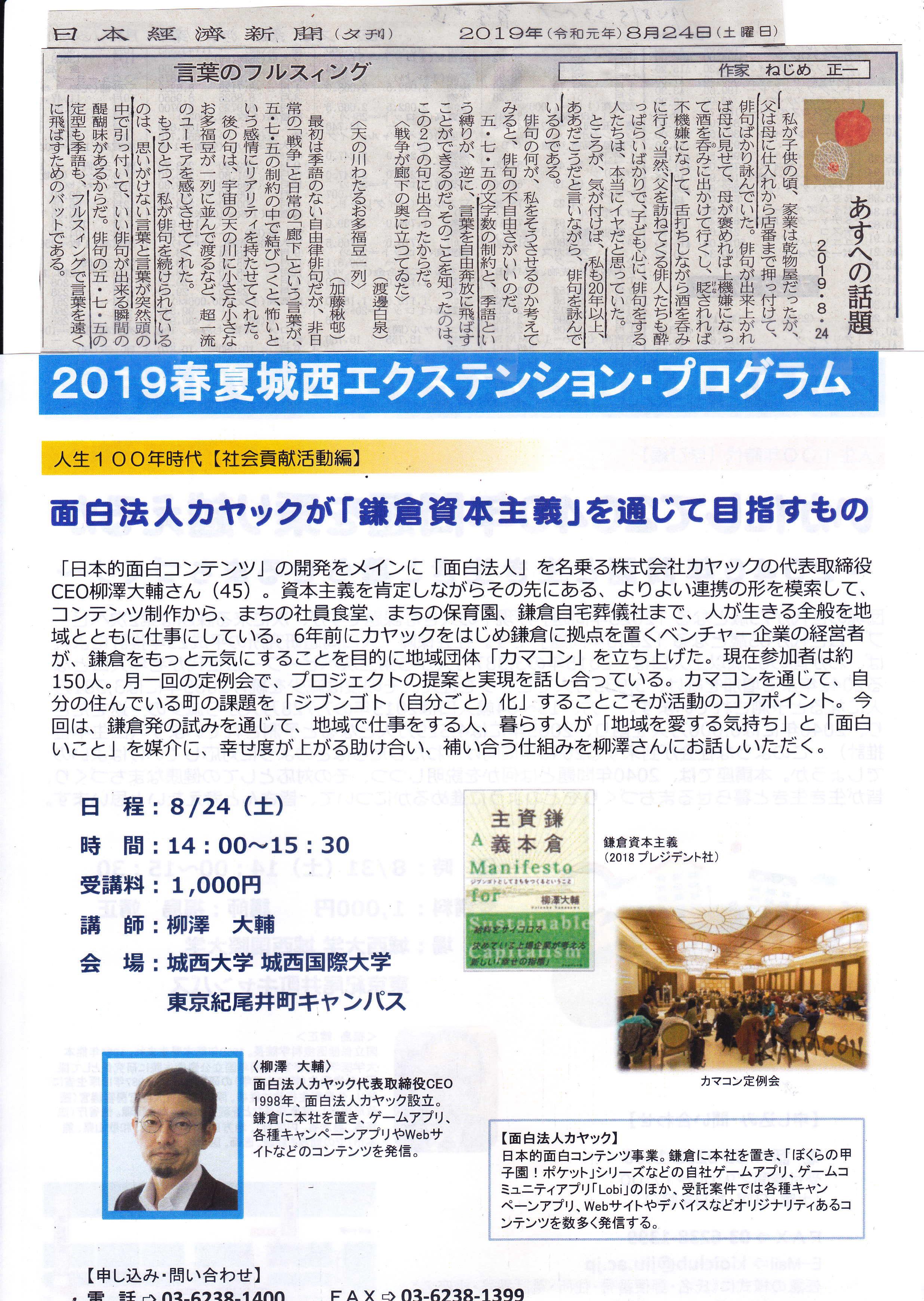 ☆賢明なる諸兄へ from Tusunami氏 8月24日の日経夕刊コラム「あすへの話題」に、作家のねじめ正一氏(昭23年生~、青学大中退)が、「言葉のふるスィング」という見出しで俳句を詠むことの意義を挙げており、思いがけない言葉と言葉が突然頭の中で引っ付いて、いい句が出来る瞬間の訪れることを書いていますが、俳人・Mr.Tigersさんも頷けるのではなかろうか、と思います。 はからずも、1昨日、城西国際大学エクステンション・プログラムに参加、面白法人カヤック代表取締役「柳沢大輔氏(昭49年・香港生~慶大環境情報学部卆・45歳)」の「面白法人カヤックが『鎌倉資本主義』を通じて目指すもの」と題する講演を聴いてきました。 「面白法人カヤック」社は、主に、ゲーム・ソフトを開発する会社ですが、6年前地元鎌倉をもっと元気にするベンチャー企業「鎌倉資本主義」、いわゆる地域団体「カマコン」を立ち上げました。 現在の参加者は約150人で月一回の定例会を開催。 そこではグループ毎のメンバーに徹底して「ブレインストーミング」を行なわせ、とにかく様々なアイデアを出し合うことを奨励しているそうです。 言わば句作を促進することに通じるか、とも思われますが、最終的にはグループのファシリテーターが数々のアイデアを集約し、実施の方向性などを評価・検討するそうです。 そのこころは、資本主義の考え方や仕組みをベースにしながら、人や企業が豊かであるために必要な「地域資本」を伸ばしていくことで、企業の成長と地域の持続可能な発展を両立させる考え方、とのこと。 すなわち、売上や利益などの「経済資本」に加え、人とのつながりやコミュニティなどの社会資本、自然や歴史などの「環境資本」という地域資本を伸ばす新しい資本主義のあり方で、今後、企業が果たしていく社会的責任、とも捉えているそうです。 以上、閑話休題まで。 草々<文字・画像拡大方法は下記*>「CTRL」+「+」を3回押してください☆・☆<めいてい君の追加> 1.寄稿者のファイルは「PDF形式」 なので Tracker社のPDFXCViewerなどで 「JPG形式」に変換してあります。 2.*文字が見辛い方は、(1).PCでは 「CTRL」+「+」を押して拡大 できます。 3回で十分です。 あとで、「CTRL」+「0(数字)」を 1回押して、元に戻してください。(2).スマートフォンでは、 二本指で拡大できます。(3).「HAZUKI ルーペ」なら問題なし。☆