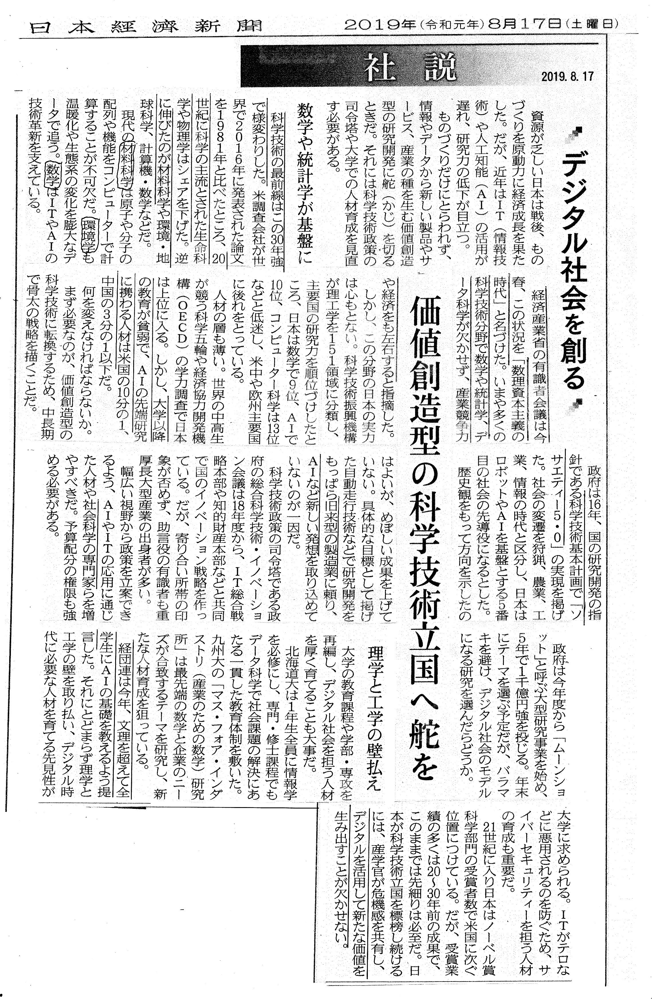 ☆賢明なる諸兄へ from Tsunami氏前略 17日朝の日経朝刊社説は科学技術の最前線の変化に触れており、その社説によると、この30年強で科学技術の最前線は様変わりし、1981年(昭和56年)に発表された論文で主流とされた生命科学や物理学は20世紀にシュアを下げ、逆に、材料科学や環境・地球科学、計算機・数学に関する論文がシェアを伸ばしている由。 経済産業の有識者会議は、今春、こうした状況を「数理資本主義の時代」と名付けているそうで、いまや多くの科学技術分野で数学や統計学、データ科学が欠かせず、これらが産業競争力や経済をも左右する、と指摘しているそうで、幅広い視野から政策を立案できるよう、AIやITの応用に通じた人材や社会科学の専門家らを増やすべき、と主張している由。 既に読了済みとは思いますが、念の為、ここもと添付送信します。 草々<文字・画像拡大方法は下記*>「CTRL」+「+」を3回押してください元に戻すには「CTRL」+「0(数字)」を押します。☆