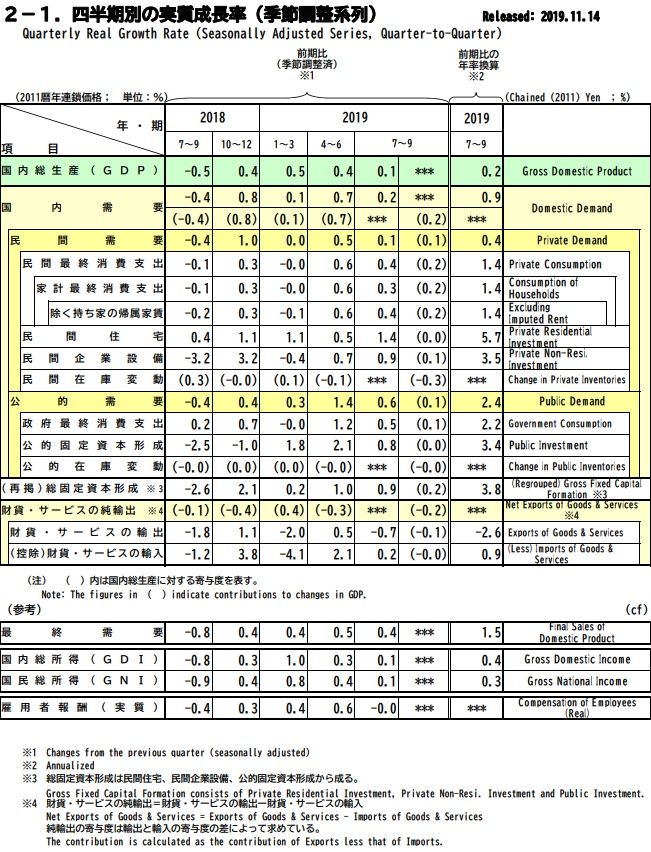 ☆ 本日の朝8時50分に内閣府から直近の7~9月期の四半期GDP第一次速報(実質季節調整済み前期比)が下記のように公表された。 現在の実質GDPの水準は年額540兆円と高水準ながら、昨年度7~9月期からのQE季節調整済み実質ベース前期比は▲0.5%→0.4%→0.5%→0.4%→「0.1%」と、此処に来て息切れがしている。 これを国内需要のGDP寄与度で見ると、▲0.4%→0.8%→0.1%→0.7%→0,2% これを純輸出のGDP寄与度で見ると、▲0.1%→▲0.4%→0.4%→▲0.3%→▲0.2%である(小数点以下が合わないのは四捨五入による。) 直近7~9月期のGDP前期比「 0.1%」への寄与度の内訳は、国内需要 0.2%、 民間需要 0.1%、 個人消費 0.2%、民間住宅 0.0%、 民間企業設備 0.1%、民間在庫変動 ▲0.3% 公的需要 0.1% 政府消費 0.1%、公的資本形成 0.0%、 公的在庫変動 ▲0.0%財貨・サービスの純輸出 ▲0.2% 同輸出 ▲0.1% 同輸入 ▲0.0%(総固定資本形成 0.2%)・・・・・・ 「純輸出入」が原油輸入の圧迫や、韓国などからの訪日来客数激減を受けており、トランプ氏の米国第一主義で商品輸出も不振で、息切れしていることを示している。 オリンピックを来年に控えた建設特需がありながらの総資本形成の微増、消費増税を控えての駆け込み需要期などでもこの程度(年額540兆円台)の横這い状態。 さらに、この10月には、地球温暖化により、今10月の台風災害の激甚化も受けて居るから、次の四半期も芳しくはあるまい。<参考資料>2019年7~9月期四半期別GDP速報 (1次速報値) 内閣府経済社会総合研究所 国民経済計算部 <文字・画像拡大方法は下記*>「CTRL」+「+」を3回押してください元に戻すには「CTRL」+「0(数字)」を押します。GDP四半期速報(QE)の季節調整済み年率額 :単位=10億円https://www.esri.cao.go.jp/jp/sna/data/data_list/sokuhou/files/2019/qe193/pdf/jikei_1.pdf☆