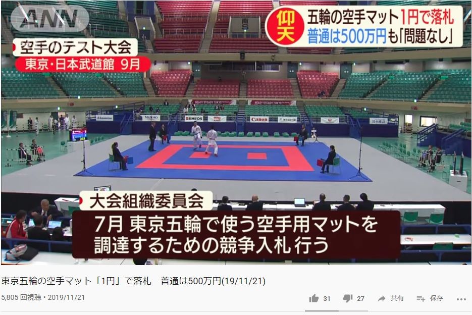 ☆ 今回の東京オリンピック工事では、「1円競争入札(税込み)が成立している」ようだ。https://www.youtube.com/watch?v=NLUVvyYpERY 武道館で使用する「空手のマット」だという。 0円契約では、丸々の「贈与を目指したもの」と推定される。 これは、想定される標準的な原価と比べてみても、異常な競争価格を提示したものとして「贈与」に該当すると判断される、違法な価格設定である。 では、1円ではどうだろうか? 原価は色んな工事の方法でも決定されるが、見積もり原価から積み上げ算定されて、それに適正な利潤が加味されて、つまり標準的な利益が加算されて工事費が見積もられる。 つまり、発注者は、工事の方法に準じて適正な利潤を加味した企業を選ばなくてはならない。 適正な利益を無視した企業を選ぶと、受注した工事が完成を待たずに頓挫する可能性がある。 少なくとも、工事を完遂できるだけの工事費かどうかを見極める眼力がない=発注する資格はないと言えよう。 1円の受注で入札を競争させるのは、発注者の入札審査資格もないし、入札の応募資格もない業者を捉えているに過ぎない。 一体、これが「入札競争を無視したダンピング行為ではない」または、「単に競争入札の名を借りた贈与ではない」と言えるのか。 もし、この製品納入で賠償問題が起こったら1円の弁済で済むのであろうか? 1円で原状復帰するために行うことが可能であろうか。 公正取引委員会がまず出動すべきではないだろうか?☆NHK News Web 2019/11/21 17:43東京五輪 空手用マット 1円で落札 一般には500万円程度 東京オリンピックの空手で使用するマットを調達するため大会組織委員会が行った入札で、業者が1円で落札していたことが分かりました。 組織委員会は「業者が今後の事業活動に有益だと判断して決めた金額で問題ない」としています。 組織委員会によりますと、東京オリンピックで空手が行われる日本武道館や練習会場で使用するマットを調達するため、ことし7月に一般競争入札を実施したところ4つの業者が参加し、このうち2社が1円で応札しました。 調達にかけたマットは一般的には全体でおよそ500万円程度するということですが、組織委員会は9月に日本武道館で行われた空手のテスト大会で2社の製品を使い、製品の品質を確認したり選手に意見を聞いたりしたうえで、先月1日に埼玉県の業者が1円で落札したということです。 組織委員会は業者間の過度な競争につながるおそれがあると判断して原則、公開してきた落札額を1円となった今回は公表していませんでしたが、報道が相次いだことを受けて21日午後、公式ウェブサイトに記載しました。 組織委員会は「ダンピングには当たらないと考える。 業者が今後の事業活動において有益だと総合的に判断して決めた金額で、われわれも品質や納品の体制に支障がないと確認できたので問題ない」としています。☆ 空手について、小生事、裸眼では、「視力表」の一番上さえ「〇でしか見えない」。 コンタクトレンズは目が痛くて、嵌められない。 であるから、空手道場では「形」を習うつもりであった。 しかし練習の中では、「組手」があり相手の拳の動きさえ見えない小生は顎に拳を食らって脳震盪となった。 小生には、申し出たように、「組手」は無理であった。 道場では師範不在であり倒れた小生は練習終了まで放置された。 以来この道場には行っていない。 数年間は、口を動かすと、ガリガリと顎の噛み合わせが聞こえたものであった。 学生時代の苦い思い出である。 空手の型は素晴らしいと思う。 特に女性は!NHK EーTV 天覧試合☆