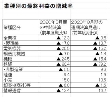 ☆ 8日に東京証券取引所の発表した一部上場企業855社(金融、電気ガスを除く全体の64.4%)についての中間決算をSMBC日興証券が業績集計を行い、それを讀賣新聞が報道した。☆ 新聞報道から自分なりに写経してみる。・・・・・・・・・・・ 売上高は1.1%増とほぼ横ばいだった。 最終利益は前年同期比▲12.3%減となった。 中間期での減益は3年ぶりとなる。 製造業では中国での需要の落ち込みなどの影響が広がり、最終利益は▲17.8%減となっている。 業種別では鉄鋼(▲80.4%減)、非鉄金属(▲49.7%減)、機械(▲24.5%減)、化学(▲22.0%減)の落ち込みが目立った。自動車などの輸送用機器(▲7.0%減)も(トヨタ以外は)振るわなかった。 20年3月期の通期見通しでは、最終利益を下方修正した企業は製造業で165社となり、上方修正した54社を大きく上回っている。非製造業では上方修正が54社、下方修正が44社だった。☆ 呆けなりの意見を加えながら、写経を続けてみる。 業績への加筆コメントを付けてみる。 ☆ 2019年7~9月期四半期速報(QE)は11月14日(木)8:50であり、あと少しである。☆