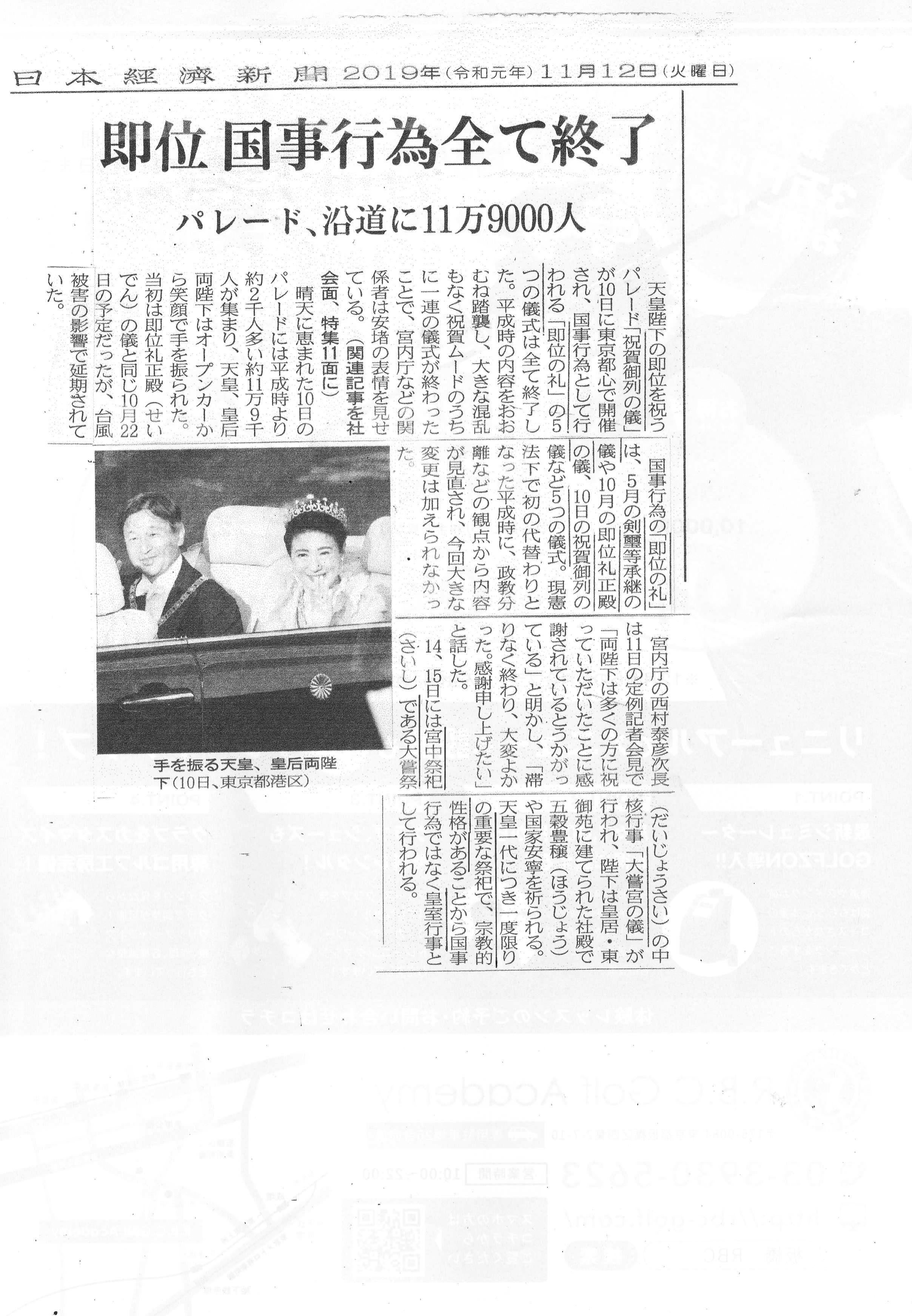 ☆<11月13日と14日の投稿を纏めています>賢明なる諸兄へ from Tsunami氏前略 11月10日、天皇即位を祝うパレード「祝賀御列の儀」が開催され、多くの人々が参道に集まり即位を祝いましたが、12日の日経朝刊は「国事行為」として行なわれる「即位の礼」について、5つの「儀式」全てが終了したと報じていましたので、念の為、ここもと添付送信します。 5つの国事行為は、ネット検索によると、次のとおり。① 剣璽等承継の儀 ② 即位後朝見の儀 ③ 即位礼正殿の儀 ④ 饗宴の儀 ⑤ 祝賀御列の儀 以上、閑話休題まで。 草々❖❖❖❖❖❖❖❖ 13日朝の日経朝刊コラム「 大嘗祭 を考える」にウォール・ストリート・ジャーナル東京特派員:ピーター・ランダース東京支局長の談話が報じられていましたので、念の為、ここもと添付送信します。 ネット検索によると、大嘗祭に似た言葉として「神嘗祭」と「新嘗祭」があります。 いずれも「収穫祭」という点で共通ですが、日時で言うと「神嘗祭(シンジョウサイ)」が先で、主神である天照大神(アマテラスオオミカミ)に先ず穀物を捧げたあと、新嘗祭(ニイナメサイ・シンジョウサイ)で他の神々へも捧げ、その後に「天皇」も食す、という流れになっている、とのこと。 一方、大嘗祭(ダイジョウサイ)は天皇が即位して初の新嘗祭(ニイナメサイ)であり、天皇在位中「1度切り」という特殊性がありますが、挙行される日時は新嘗祭と同じです。 大嘗祭と新嘗祭とが区別されるようになったのは「律令制」の時代になってからだそうで、天皇が即位する毎に「大嘗祭」が執り行われるようになったとのこと。 以上、蛇足です。 草々❖❖❖❖❖❖❖❖ 13日の日経夕刊に、その時代の天皇が即位して初めて行なう「新嘗祭」、即ち、「大嘗祭」が明日から執り行われるのに先立ち、その舞台となる「大嘗宮」の写真が掲載されましたので、念の為、ここもと添付送信します。「大嘗祭の儀」は、明日14日夕~15日未明にかけて営まれるとのこと。 一方、去る11月7日付日経夕刊で、メディア環境学者・久保友香氏(昭52生~、平12慶大理工・平18東大博)が、民俗学者・神埼宣武氏(昭19生~、武蔵野美大・國學院大卆)著「まつりの食文化」(角川出版刊)を紹介していましたので、併せて添付します。 神埼氏によると、古来、米粒にはイネの霊力「稲魂(イナタマ)」が宿っており、米粒を凝縮させた「団子」、「餅」、さらには「酒」などに霊力が強く宿り、これらを人々が食することで「稲」の霊力が人々にも移り宿る、とされ、1年の節目として全国各地で「まつり」が行なわれてきた、とのことです。 余談ですが、五穀豊穣を祈る「新嘗祭」が日本古来の「まつり」の原型になったとか…。 以上、雑談です。 草々❖❖❖❖❖❖❖❖前略 14日の新聞各紙は「令和」新時代の大嘗祭を特集していると思いますが、念の為、14日朝の日経記事を抜粋、ここもと、添付送信します。 「大嘗祭」の起源は、7世紀の天武・持統天皇の時代まで遡る由。皇位継承に伴う重要な皇室行事で、「新天皇」はその年に収穫されたコメやアワなど「新穀」を神前にお供えし、自らも食して国や国民の安寧と五穀豊穣を祈る行事とのこと。 天皇陛下は、東日本「悠紀(ユキ)地方(京都の以東・以南)」の齋田(神に供えるコメを栽培する田)と、西日本「主基(スキ)地方(京都の以西・以北)」の齋田でとれた新穀や神酒を、大嘗宮のなかの「悠紀殿(ユキデン)」と「主基殿(スキデン)」のそれぞれに供え、食されるそうです。 以上、閑話休題です。 草々<文字・画像拡大方法は下記*>「CTRL」+「+」を3回押してください元に戻すには「CTRL」+「0(数字)」を押します。☆・☆<めいてい君の追加>1.寄稿者のファイルは「PDF形式」 なので Tracker社のPDFXCViewerなどで 「JPG形式」に変換してあります。 2.*文字が見辛い方は、(1).PCでは 「CTRL」+「+」を押して拡大 できます。 3回で十分です。 あとで、「CTRL」+「0(数字)」を 1回押して、元に戻してください。(2).スマートフォンでは、 二本指で拡大できます。(3).「HAZUKI ルーペ」なら問題なし。☆・画像はWIKIPEDIA、NHK,宮内庁、官邸など① 剣璽等承継の儀 ② 即位後朝見の儀 ③ 即位礼正殿の儀 ④ 饗宴の儀 ⑤ 祝賀御列の儀 ☆WIKIPEDIAから補完<八咫鏡(やたのかがみ)>☆・ 大嘗祭 →北☆
