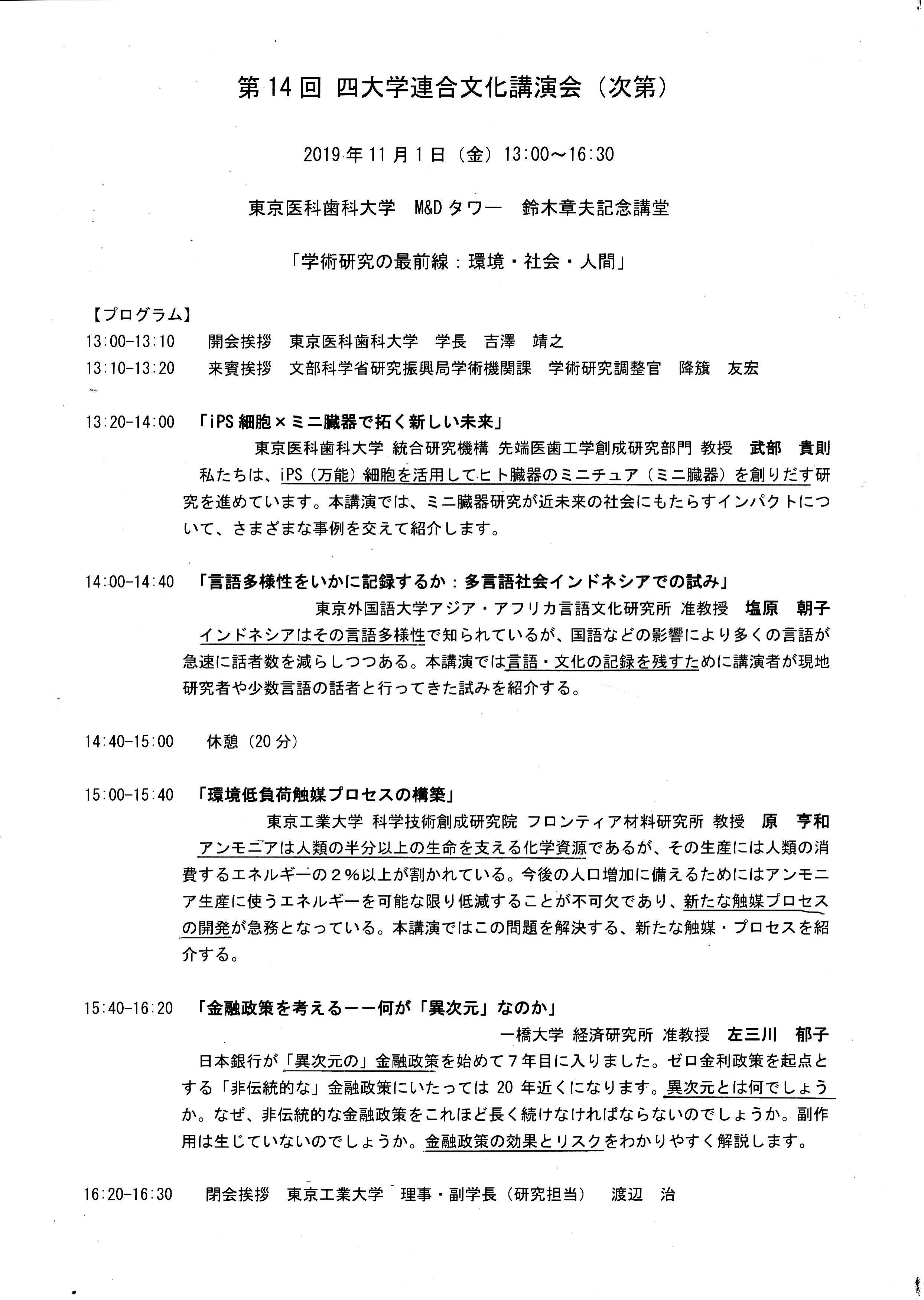 ☆賢明なる諸兄へ from Tsunami氏前略 2001年(平13年)、東京医科歯科大・外語大・東工大・一橋大の4大学は連携し、4大学に在学する学生は他大学の学科を選択し自身の単位取得数に加えることができる制度を導入、更に、2005年(平17年)から「四大学連合文化講演会」を開催、本日で第14回を迎えました。 そこで、これを聴講してきましたので、当日のプログラムを、ここもと、添付送信します。 一橋大学 左三川准教授は「金融政策を考える ―― 何が「異次元」なのか」と題して講演しましたが、デフレ経済が長引いているためか、最近の学生はそれを当然と考え、むしろ、日銀の2%インフレ目標を怪訝そうに考えている由。 また、現在、銀行は長引くマイナス金利で貸借金利が逆ザヤとなっており、預金者の預金通帳発行コストや通帳貼付の印紙代、事務員のコストなどを考慮、いずれ「口座保管料」を徴収する時代になるのではなかろうか、と話していました。 一方、日銀は手数料の低い大量のETF(Exchange Traded Fund)を買い増しており、その売買リスクは避けられず、いわば国民通貨の使途として妥当か、疑問を呈していました。 ネット検索による、一橋大学の講演者左三川 郁子 准教授略歴は、次のとおり。 1990年(平2年): ロンドン大SOAF(School of Oriental and African Studies)卆 2004年(平16年):一橋大修経 2010年(平22年):慶大博商 以上、閑話休題まで。 草々<文字・画像拡大方法は下記*>「CTRL」+「+」を3回押してください元に戻すには「CTRL」+「0(数字)」を押します。☆・☆<めいてい君の追加>1.寄稿者のファイルは「PDF形式」 なので Tracker社のPDFXCViewerなどで 「JPG形式」に変換してあります。 2.*文字が見辛い方は、(1).PCでは 「CTRL」+「+」を押して拡大 できます。 3回で十分です。 あとで、「CTRL」+「0(数字)」を 1回押して、元に戻してください。(2).スマートフォンでは、 二本指で拡大できます。(3).「HAZUKI ルーペ」なら問題なし。☆・講演者一覧☆・日本経済研究センターの刊行物☆・四大学連合文化講演会 第8回~第14回講演プログラム☆