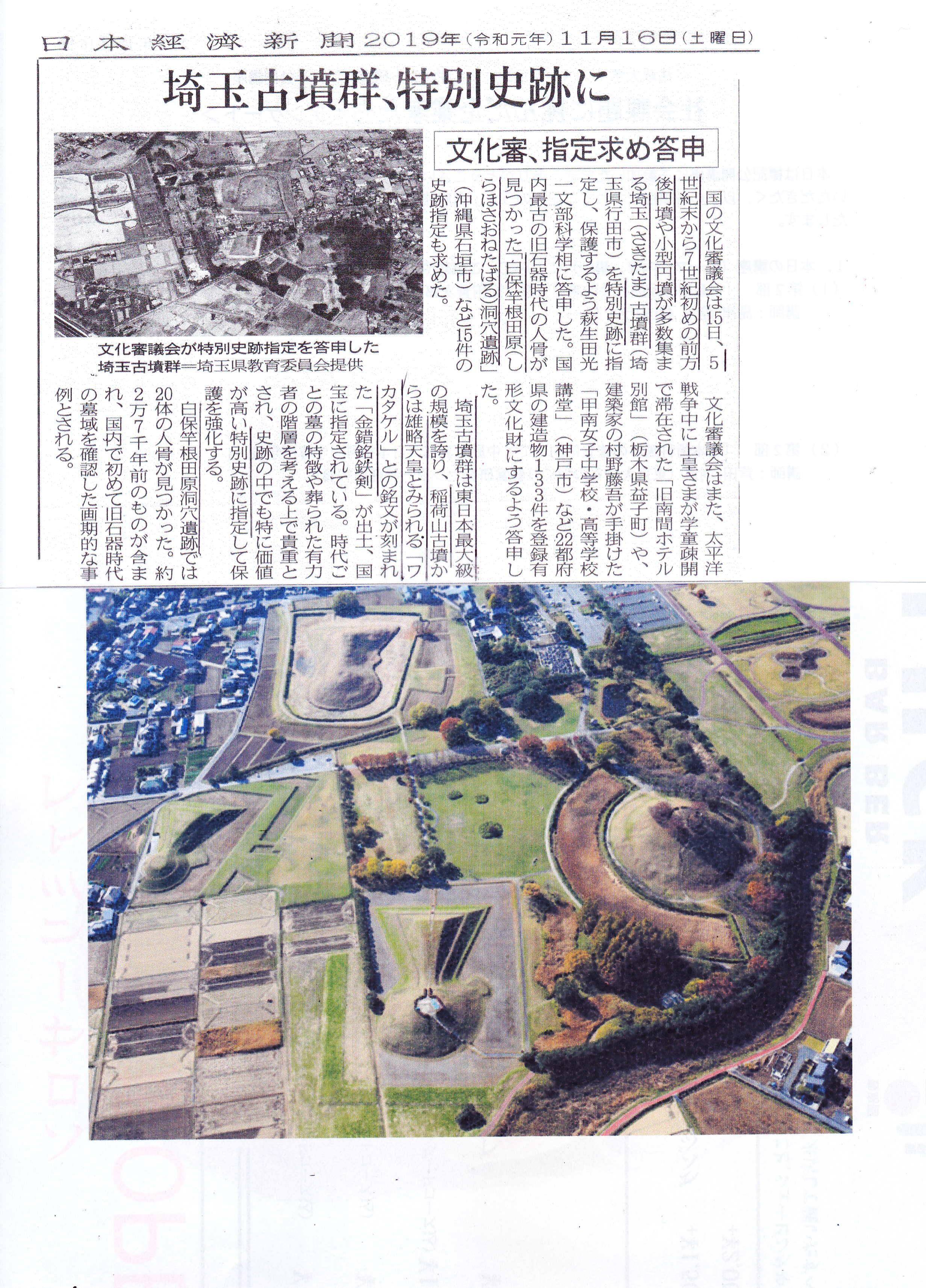 ☆賢明なる諸兄へ from Tsunami氏 前略 11/16 朝の日経新聞によると、文化審議会は埼玉県行田市にある「埼玉古墳群」を「特別史跡」に指定し保護するよう文科省に答申した、と報じていますので、念の為、ここもと添付送信します。 古墳群のうち、稲荷山古墳からは、日経新聞朝刊小説「ワカタケル」とされる雄略天皇の銘文が刻まれた「金錯銘鉄剣」が出土され国宝に指定されていますが、埼玉古墳群が「特別史跡」に指定されることを祈念しています。 以上、取り急ぎ祝意まで。 草々☆・☆<めいてい君の追加>1.寄稿者のファイルは「PDF形式」 なので Tracker社のPDFXCViewerなどで 「JPG形式」に変換してあります。 2.*文字が見辛い方は、(1).PCでは 「CTRL」+「+」を押して拡大 できます。 3回で十分です。 あとで、「CTRL」+「0(数字)」を 1回押して、元に戻してください。(2).スマートフォンでは、 二本指で拡大できます。(3).「HAZUKI ルーペ」なら問題なし。☆