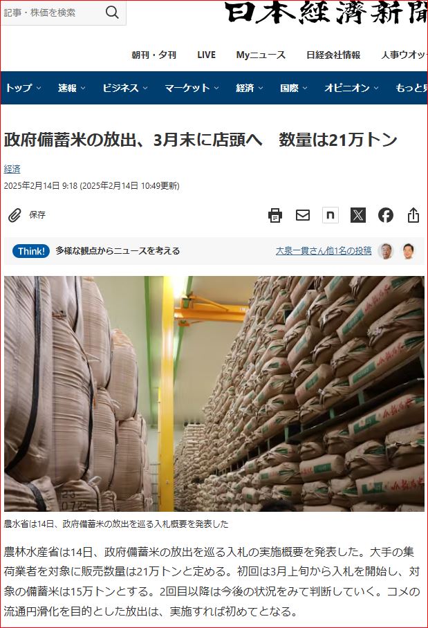 ★政府は備蓄米を放出★読売新聞2025.02.15 朝刊★