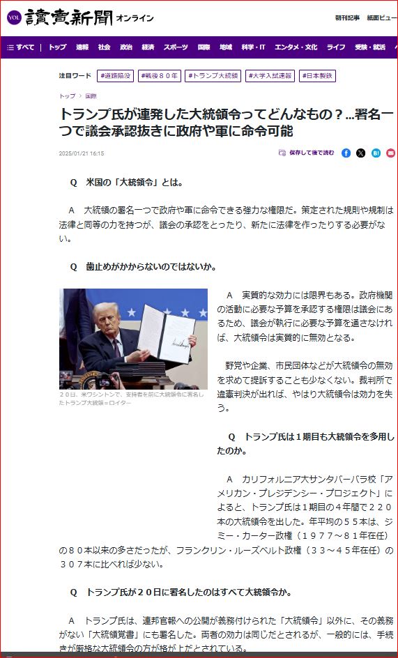 ★画面の拡大は「CTRL」+「+」を数回押す画面を元に戻すのは「CTRL」+「0」を1回押す★ 露の旧友となりつつある 返り咲き米国大統領 露というと露大統領・プーチン氏である。 その旧友である米大統領がたった今、米大統領の「誤った認識」に左右されようとしている。 新米大統領トランプ氏は下記のように世界を誤った認識のもとに導こうとしているが、少なくとも大統領となった以上は自分の誤った認識「ロシアがウクライナを襲ったのは、ウクライナに非がある」を正すべきではないだろうか。 「ロシアは自分から手を出しているのであり、この動きを察知したウクライナがNATOへの加盟を望んでいるのである。 トランプ氏の誤った認識を正す、カードを引くものは果たしているのであろうか。 以上は、下記の読売新聞の記事・論説などでみたものである。 拡大範囲では、無理なら是非とも今日の読売新聞をご購入ください。★