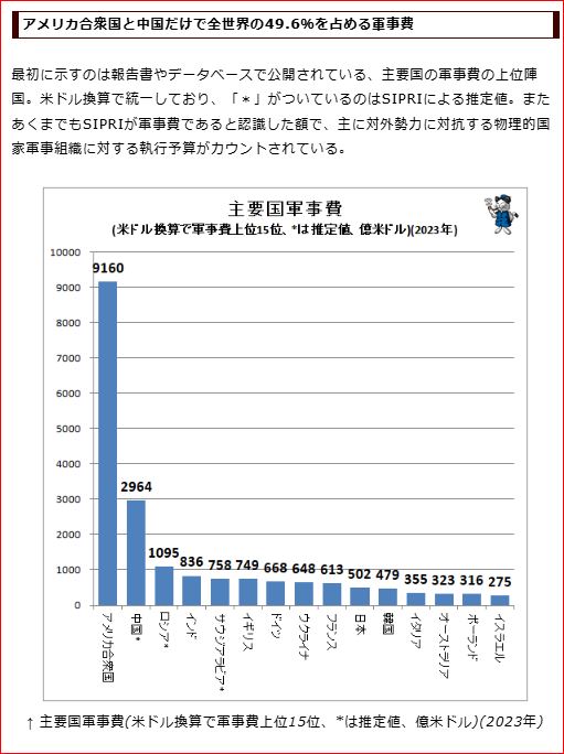★3月6日中国の軍拡・内需拡大について1. 2025年度 国防費の国家予算ランキング米国<予定> 米国第一主義へ転換❓ バイデン→トランプ 民主党→共和党 2023年SIPRI 9,160億ドル 全体の37.5%**中国<予定> 1兆7,846億元 * (約36兆7,600億円)* 全体の12.3%** 以上で約半分ロシア<前年>13兆5,000億ルーブル 約19兆円 全体の4.5%ウクライナ<前年>2兆2,248フリブニャ 約8兆円EU加盟国<予定>約8,000億€ (約127兆円) 日本<予定> 約8兆7,005億円 (過去最大) 2. Gabage News による世界の軍事費 2023年度の推定値→SIPRI3. 讀賣新聞オンライン★