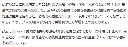 ★防衛予算案 最大の8.7兆円 トランプ政権で増額圧力も ~日本経済新聞★