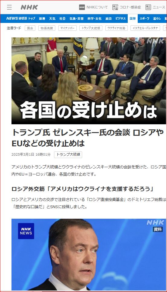 ★ EUカヤ・カラス外相、「力の支配」台頭を非難 ・・・AP=時事~3/12 国連安全保障理事会の対EU関係に関する会合で、国際法を「力の支配」に置き換える試みが世界中で増加しており、ロシアのウクライナ侵攻はその一例にすぎないとの見解を示した。 読売新聞では、さらに、この動きが中国を利すると言及・指摘している。 「米政治家はトランプ氏には逆らえない」・・・「暴君・ネロ」演説に例える仏議員もいる。 (クロード・マルリュ上院議員) 「国際社会で大きな発言力を持つのは、人口、軍事、経済の超大国(米国、中国、ロシア、インド)またはEU、ASEANのような国家連合である。 日本はアフリカ会議(TICAD)を重視しているというが、現在はアフリカ在住の中国人が100万人いるのに対して、日本人が~1万人以下に過ぎない。 日本の影響力が年々に低下しているという。 「目の覚めるような、かつ地球温暖化対策や、対米関係を損なわないような工夫」が必要である。」★
