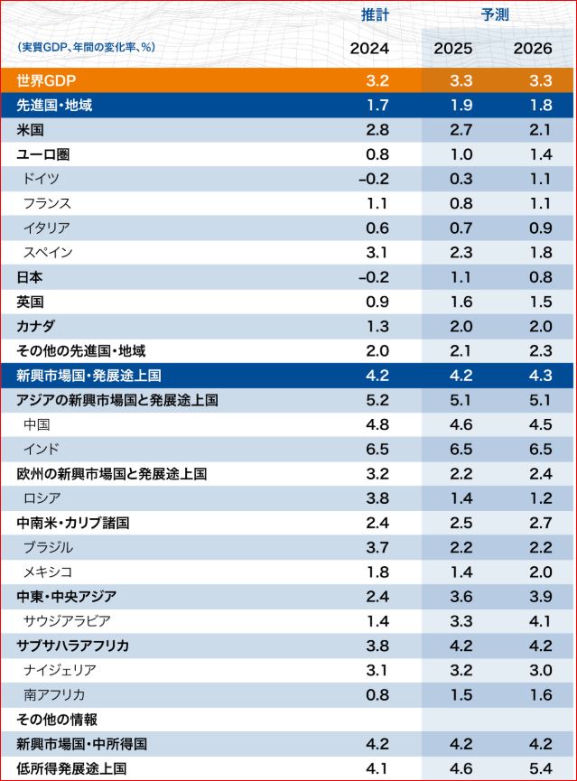 ★米国景気は2024年10~12期までは 前期比年率2.3%と11期連続で 順調ながら、 前期からペースを落とした1.米国景気概況(2025年2月) ~ 三菱UFJリサーチ&コンサルティング景気は底堅いか❓ 米国経済は底堅く推移している。 2024年10-12月期の実質GDP成長率(速報値)は 前期比年率2.3%と、11期連続でプラス成長となった。 個人消費が同4.2%増と大幅に増加し成長率を押し上げた。 一方、設備投資は同2.2%減とおよそ3年ぶりに減少し増勢 が一服した。 企業の景況感を示すISM景況指数は、製造業で判断の目安 となる50の水準を2年3ヶ月ぶりに上回ったほか、非製造業 も堅調に推移している。 先行き、個人消費がこれまで好調に推移した反動などで 弱含むとみられるが、全体として景気は底堅く推移する 見通しである。2.米国経済マンスリー: 2025年2月 ~ノイズを見極める~ | 前田 和馬 | 第一生命経済研究所 米国経済は総じて堅調さを保っているものの、 1月の雇用者数や小売売上が市場予想を下回るなど 緩やかな減速の兆しを示している。 1月は悪天候等の一時要因が影響した可能性はある ものの、今後も移民流入の減速等を背景に、景気 鈍化ペースがより鮮明となるリスクに警戒が必要 だろう。 1月の消費者物価指数は市場予想を上回るなど、 インフレ再燃の懸念は依然払拭されるに至って いない。今後は対中関税等の引き上げが財政イン フレの加速を招くリスクがあり、FRBは当面の間 利下げを停止し、こうした不確実性を見極める 姿勢を明確にしている。1月20日のトランプ政権 発足後、閣僚承認が比較的スムーズに進行する 一方、関税政策を巡る不確実性は高い状況が続い ている。3月4日に対メキシコ・カナダへの25% 関税、4月2日に自動車関税がそれぞれ発動される リスクが浮上するなど、引き続き関税政策の動向 が注目される。3.【2025年最新】世界GDP(国内総生産) ランキング(IMF) 日本のGDPは世界4位を維持も、 5位インドとの差はさらに縮小 セカイハブ順位 国名 名目GDP2025年 同成長率1 アメリカ 30兆3,371.6億ドル 4.0% 2 中国 19兆5,348.9億ドル 6.9%3 ドイツ 4兆9,215.6億ドル 4.5%4 日本 4兆3,893.3億ドル 7.8%5 インド 4兆2,719.2億ドル 9.8% 6 イギリス 3兆7,302.6億ドル 4.0%7 フランス 3兆2,834.3億ドル 3.4% 8 イタリア 2兆4,596.0億ドル 3.5%9 カナダ 2兆3,303.1億ドル 5.2%10 ブラジル 2兆3,071.6億ドル 5.4% 4.IMFの世界経済見通し 実質GDP成長率予測★