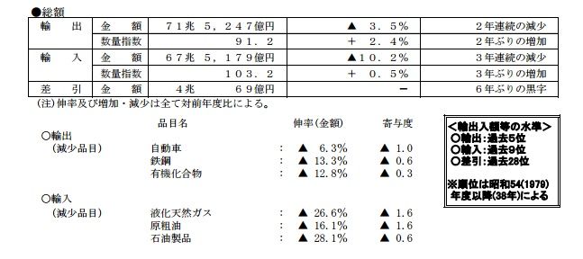 貿易収支 は4兆円と前年から 5.1兆円改善されているが、